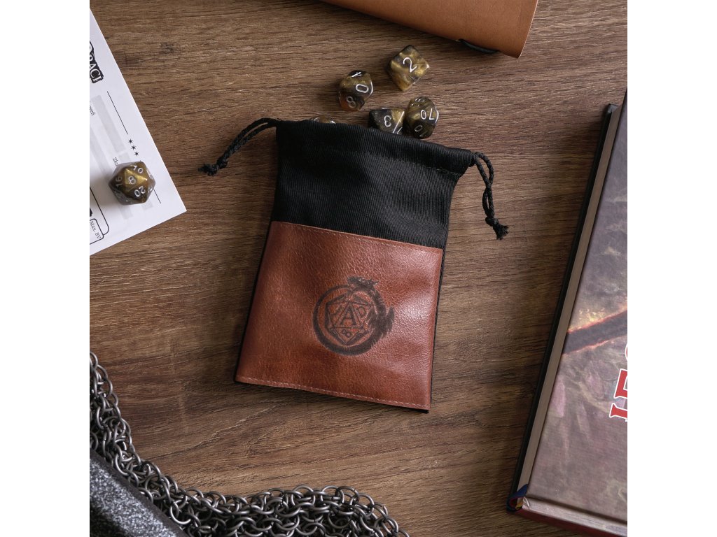 Pevný plátěný váček na kostky vyrobený v naší dílně. Pytlík má rozměry 9 x 13 cm a snadno se do něj vejde několik sad kostek, ale také figurky, žetony a další drobnosti, které potřebujete ke hraní her na hrdiny. Váček je ozdobený pruhem kvalitní hovězí kůže, do které je vypáleno dračí logo. Váček je určený především pro fanoušky Jeskyní a draků, ale díky nádhernému zpracování udělá radost každému hráči RPG. Ať už máte rádi Jeskyně a Draky, Dungeons & Dragons, Dračí doupě nebo Dračí hlídku, pořiďte si tenhle stylový váček, který vám budou ostatní závidět. Cítíte se zbytečně svázáni rigidními pravidly řádu? Vyzkoušejte naši pokřivenou variantu váčku chaosu.