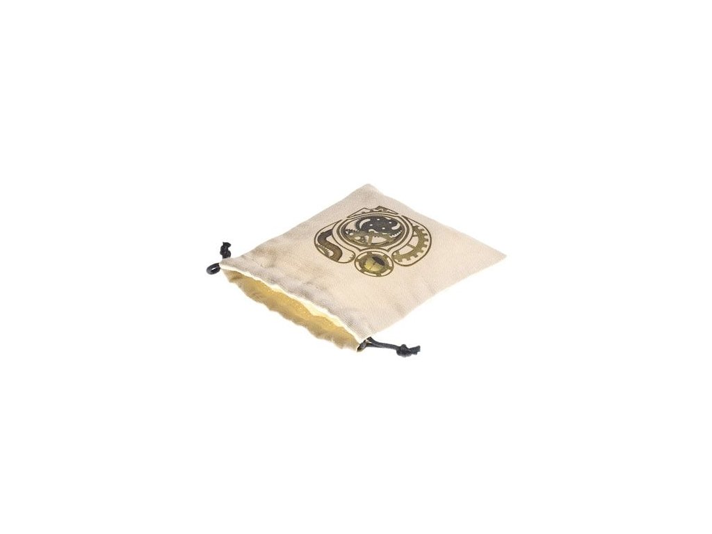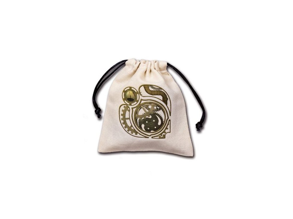 Plátěný stahovací váček na kostky zdobený steampunkovým obrazcem. Rozměry váčku jsou 10 x 13 cm.