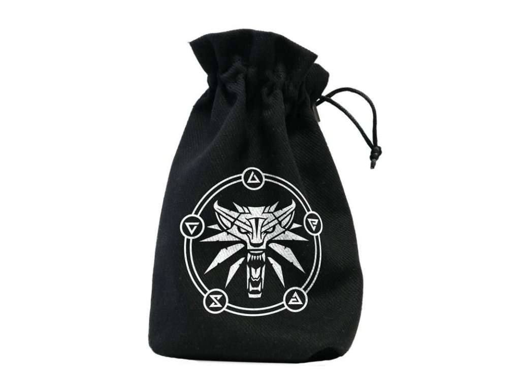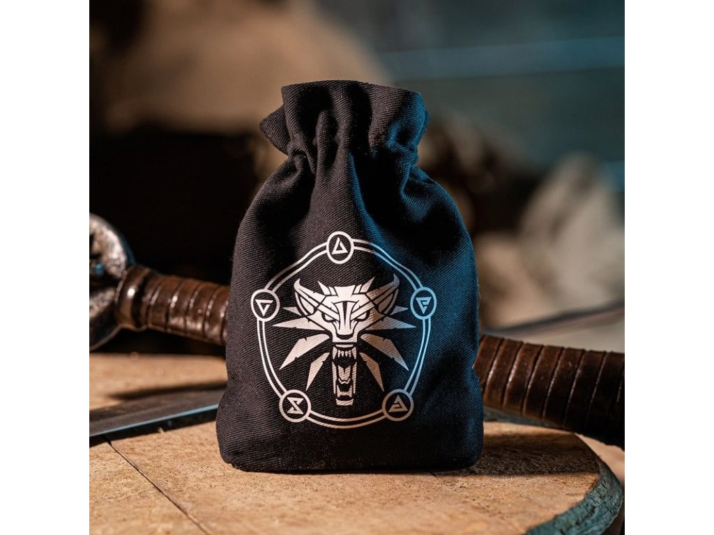 Černý bavlněný váček na kostky s bílým znakem školy Vlka v kruhu pětice mocných zaklínačských run, skvělý pytlík pro kostky všech fanoušků Geralta z Rivie! Pytlík se stahuje pomocí tkaničky s brzdou a pojme až pět sad kostek.