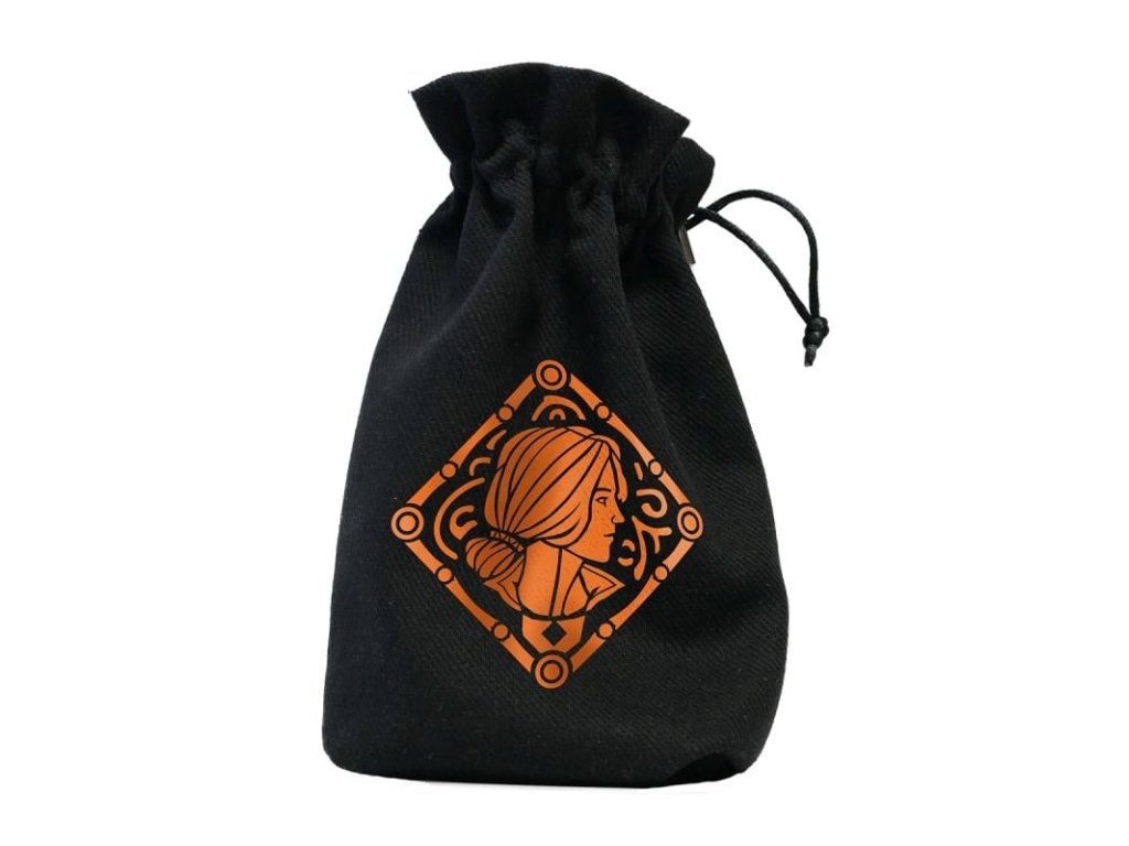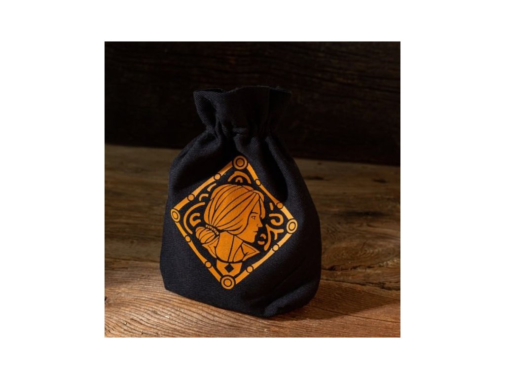 Černý bavlněný váček na kostky s oranžovým obrázkem čarodějky Triss ze Zaklínače, věrné Geraltovy kamarádky a spojenkyně! Pytlík se stahuje pomocí tkaničky s brzdou a pojme až pět sad kostek.