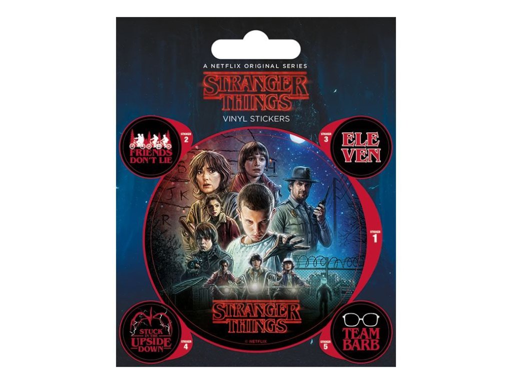 Sada obsahuje 5 kulatých vinylových samolepek (4x menší a 1x velkou) s motivy z oblíbeného hororového seriálu Stranger Things.