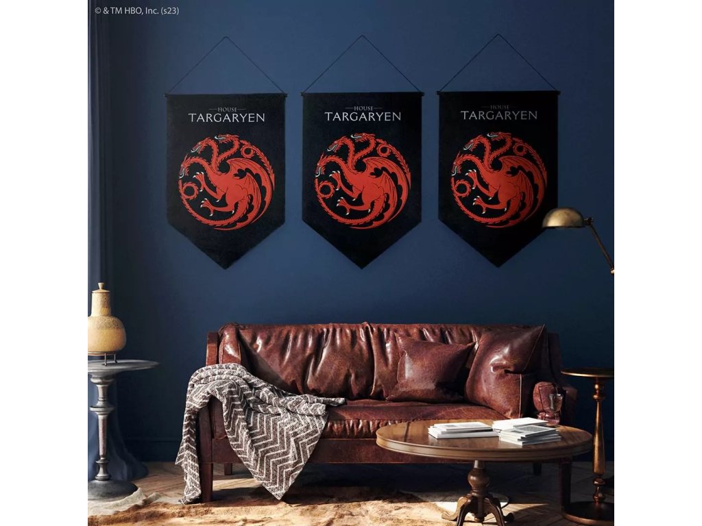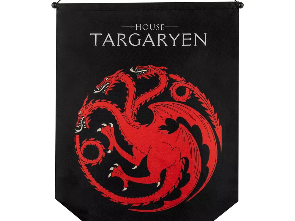 Originální nástěnná vlajka se znakem rodu Targaryenů ze Hry o trůny - Game of Thrones bude skvělým doplňkem vašeho domova, kanceláře, nebo rodového sídla na oblíbeném LARPu.