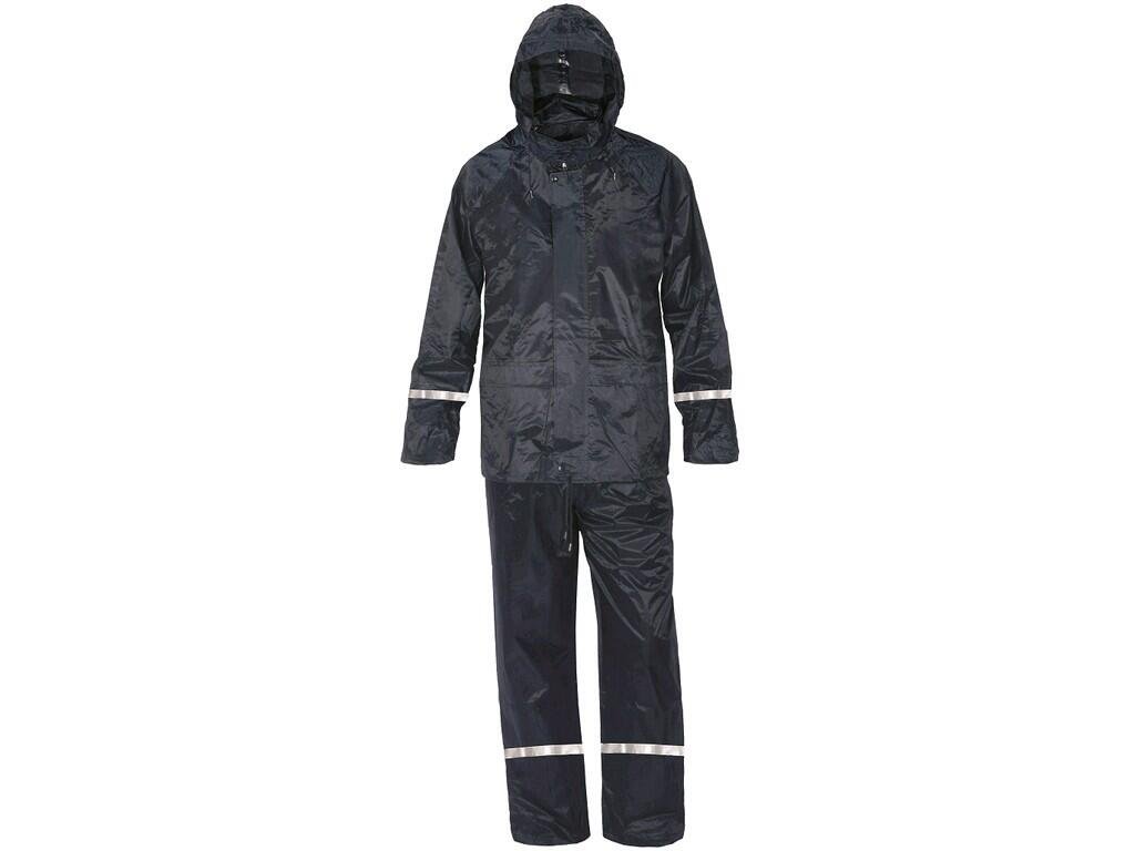 Nepromokavý oděv do deště s kapucí v límci, nižší hmotnost. Zapínání na zip, stahování v dolním okraji, větrání na zádech a v podpaží, kalhoty v pase do gumy, lepené švy. Praktické balení na zip. Reflexní doplňky u modré a zelené varianty.