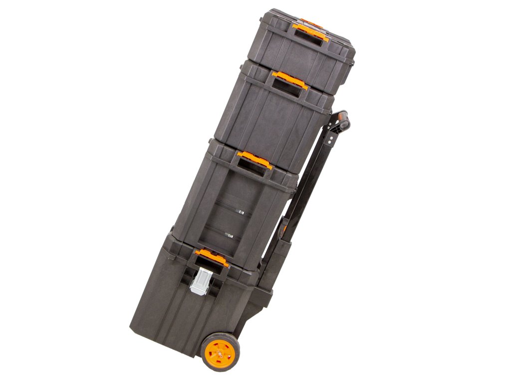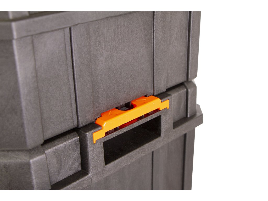 Vodotěsný kufr, 2 zásuvky a horní víko, 3 madla pro snadné přenášení, zásuvky obsahují přihrádky na drobné nářadí.