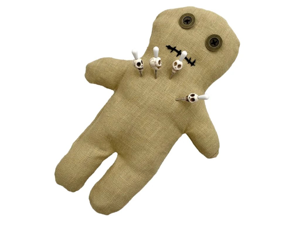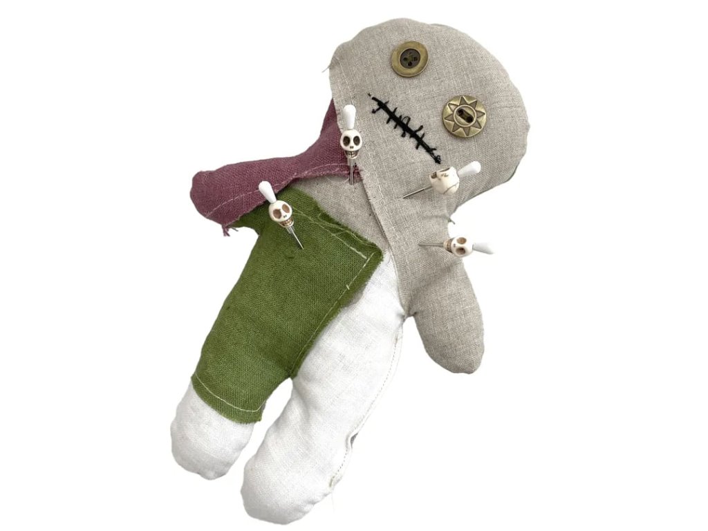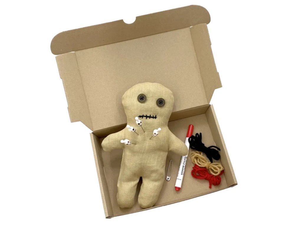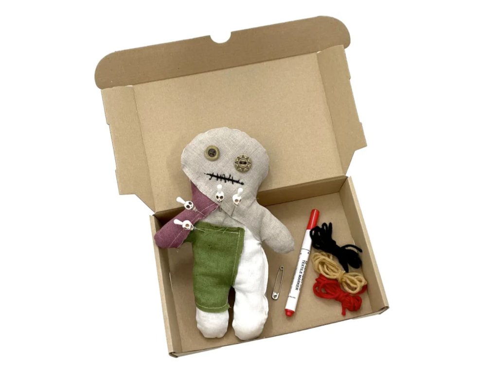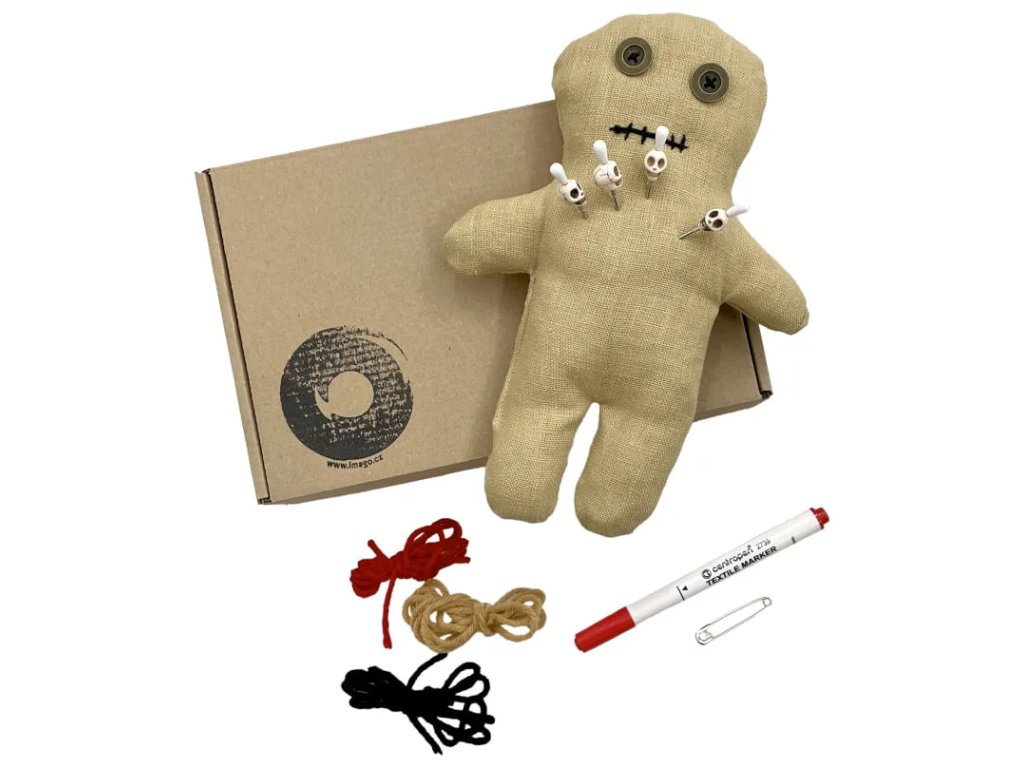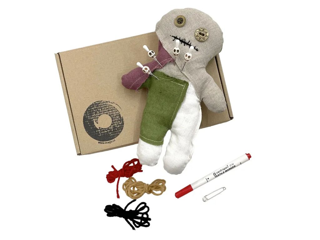 Voodoo set obsahuje vše, co potřebuješ k tvorbě kouzel a kleteb - ideální volba pro začátečníky! Vytvoř si vlastní rituál během halloweenské noci, nebo věnuj Voodoo panenku jako originální dárek. Set se skvěle hodí i jako rekvizita na tematický LARP, kde se může stát ústředním prvkem tvé postavy. Vyber si mezi dvěma verzemi panenky - lněnou, která přináší autentický přírodní nádech, nebo patchwork, která má pokaždé originální vzhled. V balení najdeš: Unikátní panenku o výšce cca 23 cm. Fix na textil - oživ panenku jedinečnými vzory, tajemnými symboly nebo jménem toho, na koho zrovna svoláváš kletbu. Fantazii se meze nekladou! Špendlíky, 4 ks - jeden z hlavních nástrojů při praktikování Voodoo, každý špendlík je vkusně ozdoben lebkou. Bavlnky, tři barvy - vytvoř panence vlasy, ať vypadá přesně jako bytost, kterou očaruješ! Spínací špendlík - stylový detail nebo pomůcka k upevnění dalších tvůrčích doplňků. Průvodní dopis s manuálem.