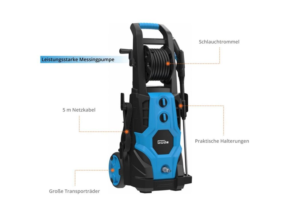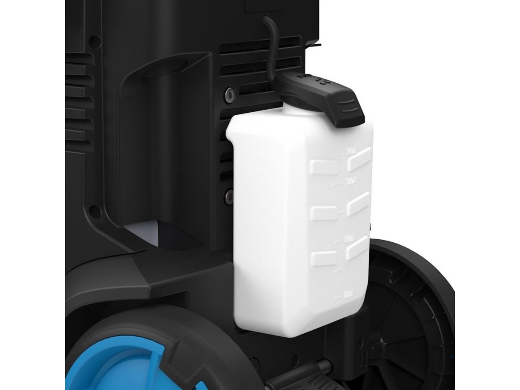 Konstrukce: plášť tlakové myčky je z tvrzeného plastu, praktické držáky příslušenství, naviják tlakové hadice, hák k zavěšení elektrického kabelu, dávkovač čisticích přípravků.