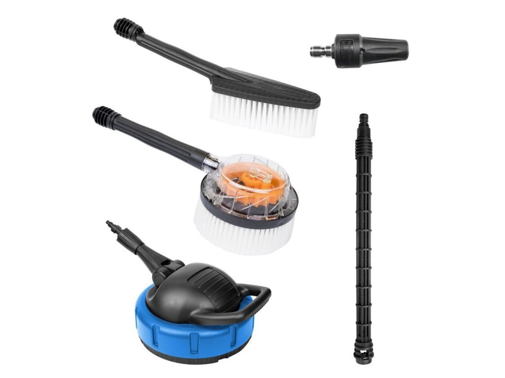 Příslušenství: 4dílná sada trysek s různými tvary vodního paprsku, rotační bodová tryska, mycí kartáče podélný a rotační, čistič ploch, hadicová přípojka vč. vodního filtru, 6 m tlaková hadice, 5 m síťový kabel H05 VV-F.