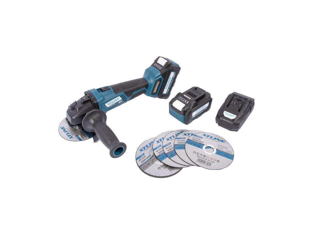 XTLINE Aku úhlová bruska bezuhlíková 18 V, 125 mm + kotouče + 2 baterie 5.0 Ah + nabíječka 3.5 A + box