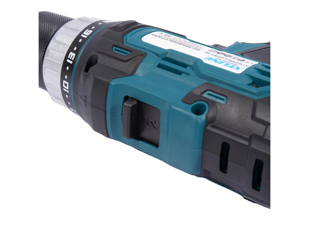 Pogumovaná rukojeť. Motorová brzda, prachotěsná planetová převodovka s kovovými převody a rychloupínacím kovovým sklíčidlem pro snadnější nasazování a vyjímání bitů jednou rukou. Vrtačka je bez akumulátoru a nabíječky. Nabíječku a samostatný akumulátor je možné dokoupit zvlášť.