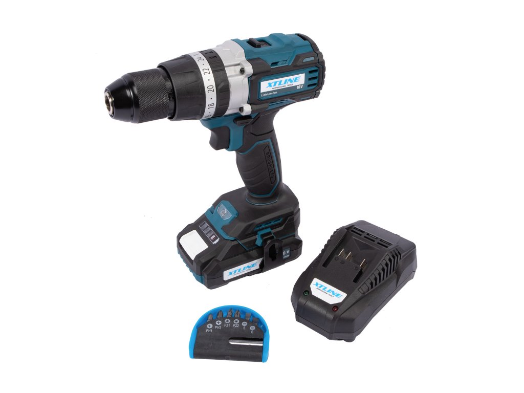 XTLINE Aku vrtačka s příklepem bezuhlíková 18 V, 70 Nm + baterie 2.0 Ah + nabíječka 2.4 A