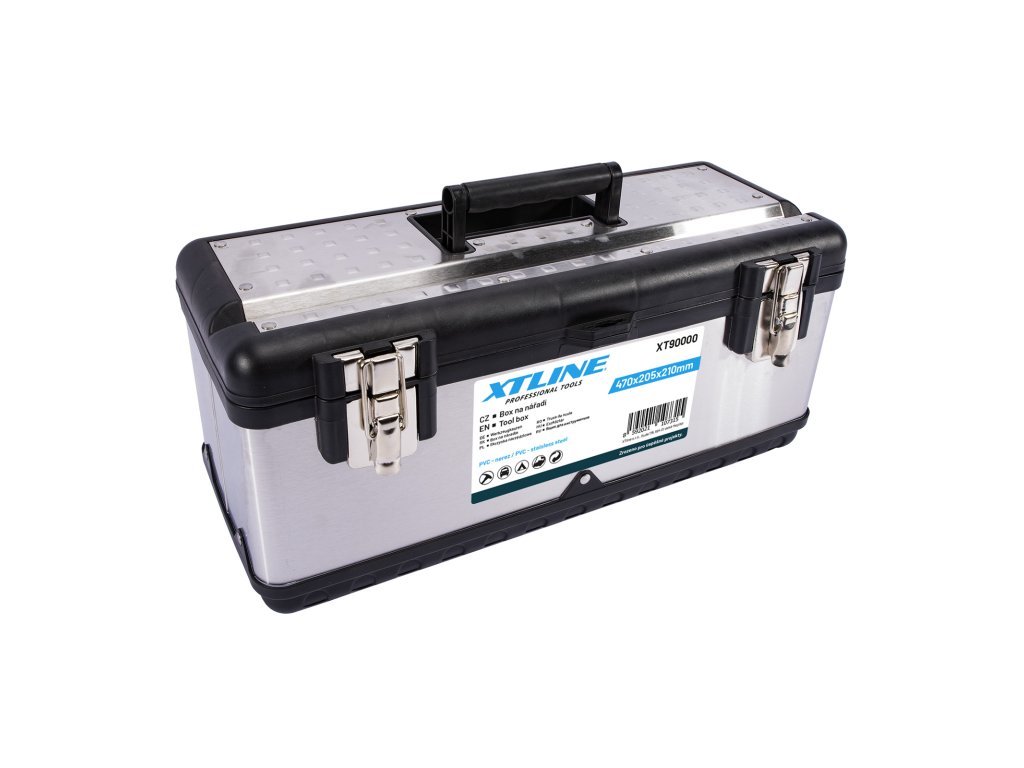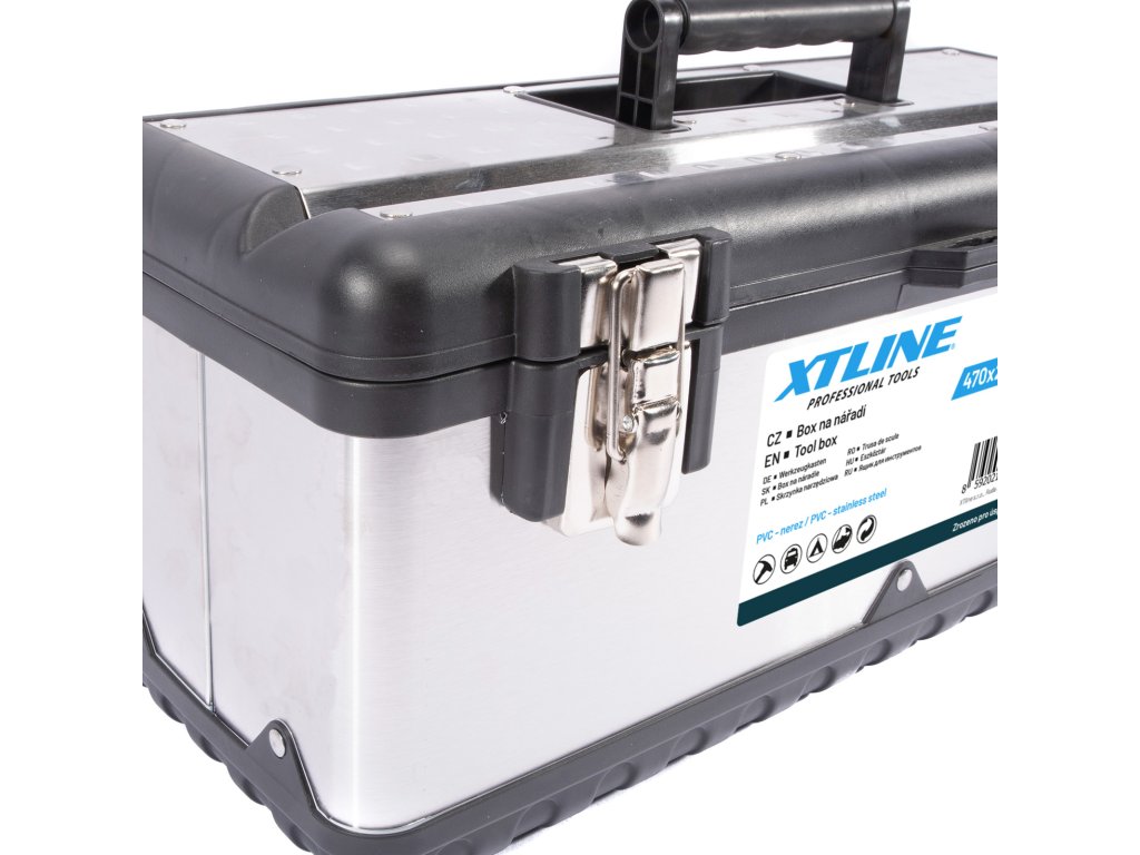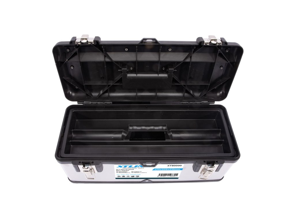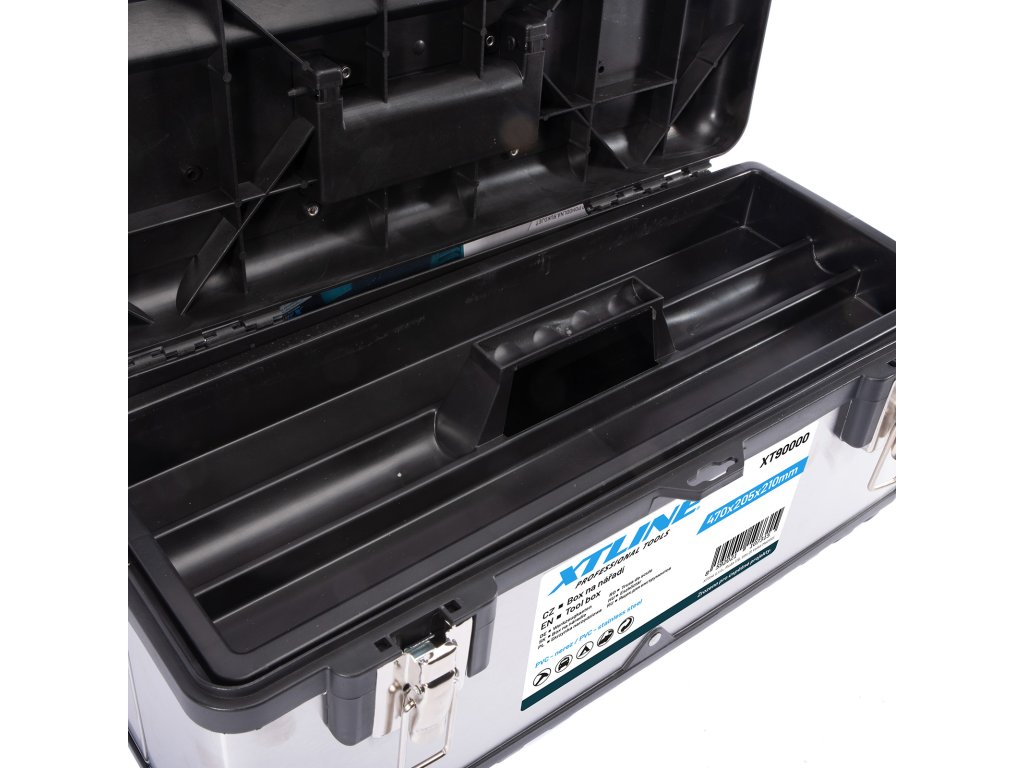 Profesionální box na nářadí v kombinaci plastu a nerezu. Pevný a odolný pro vysokou zátěž, je možné jej použít i jako stupínek (max. 100 kg). Kovové přezky a oko na uzamčení visacím zámkem. Žlábek pro zakládání trubek a latí při řezání.