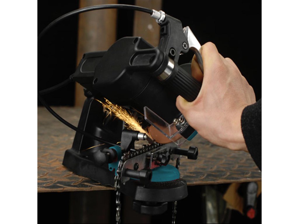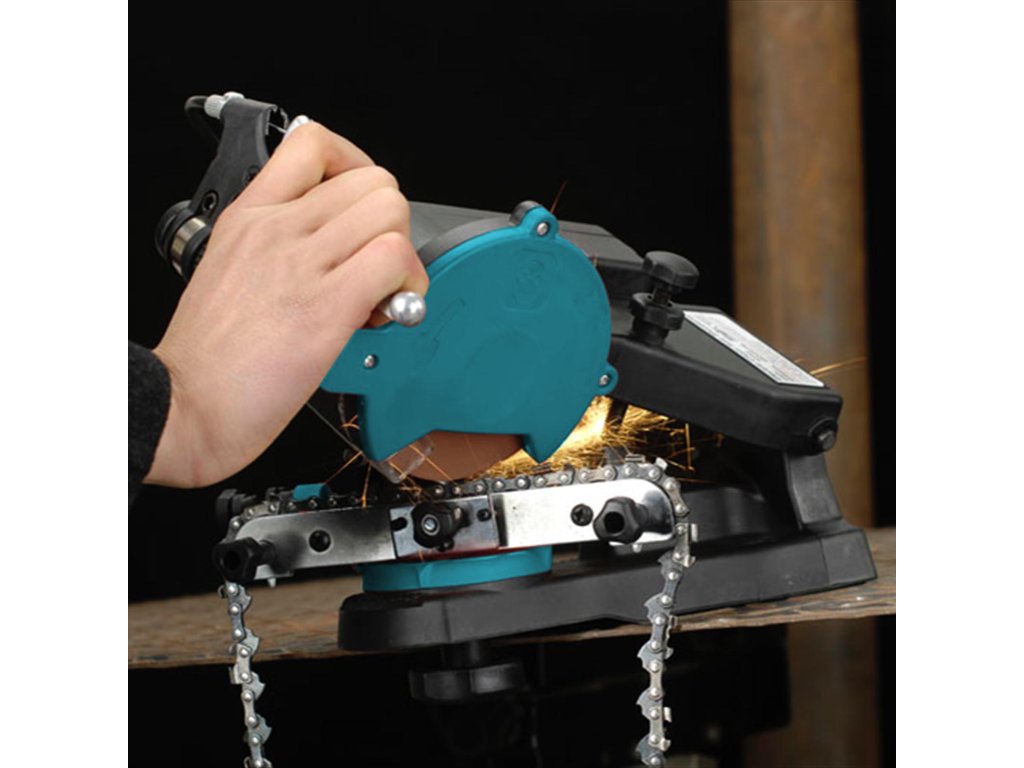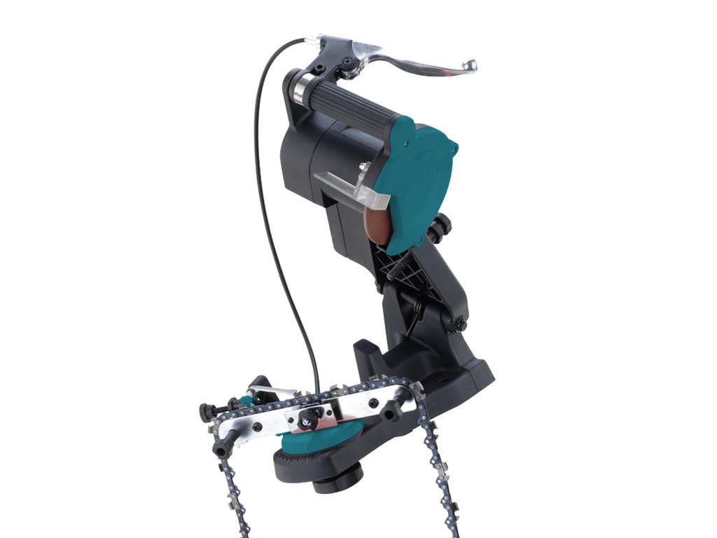 Bruska je určena k broušení řetězů motorových pil. Ocelová svěrka je ovládána pákou na rukojeti, což urychluje práci.