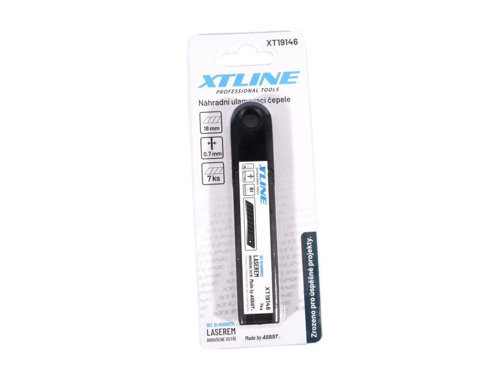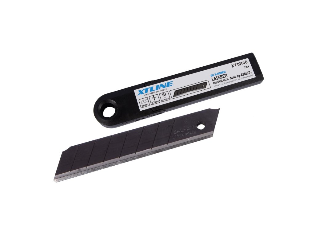 Náhradní čepele 18 mm s břitem z materiálu SK2 pro všechny druhy ulamovacích nožů. Balení 10 kusů v plastové krabičce s okem na zavěšení. Broušení břitů s laserovou technologii zvyšuje životnost. Břit SK2 s černou povrchovou úpravou zaručuje vysokou ostrost a tvrdost. Břit ostřený pod třemi úhly prodlužuje životnost čepele.