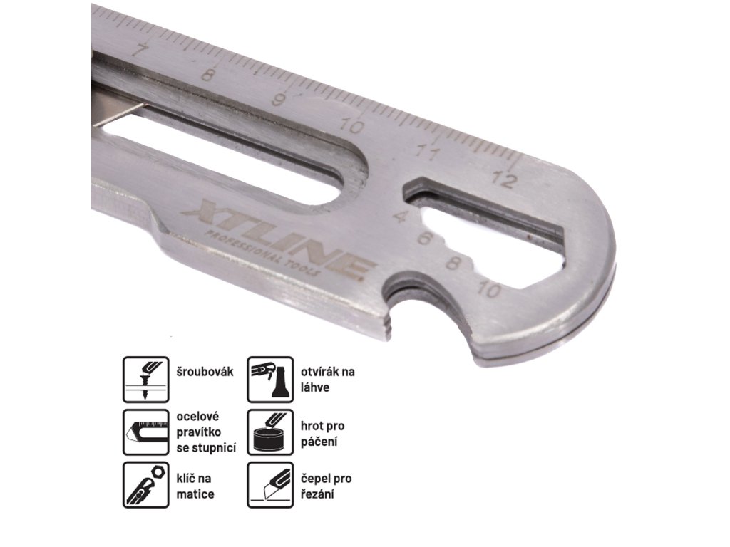 Ostatní vlastnosti: | šroubovák, ocelové pravítko se stupnicí, klíč na matice, otvírák na láhve, hrot pro páčení, čepel pro řezání |