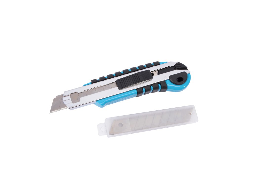 Kovový ulamovací nůž se zásobníkem a 10 čepelemi.