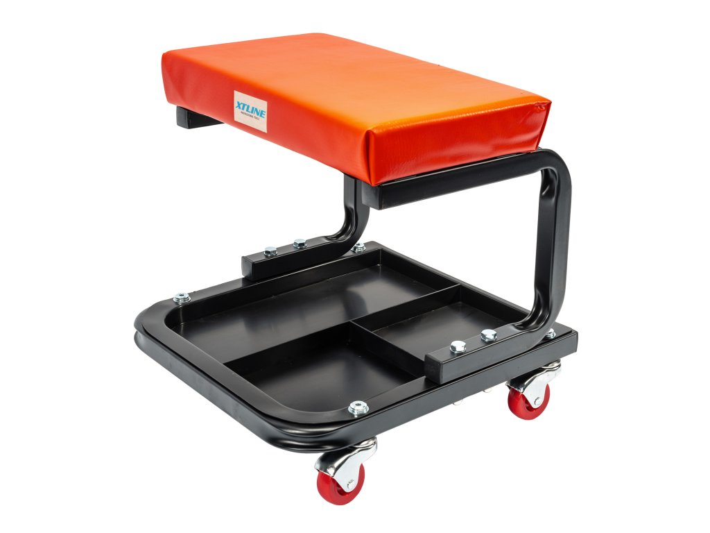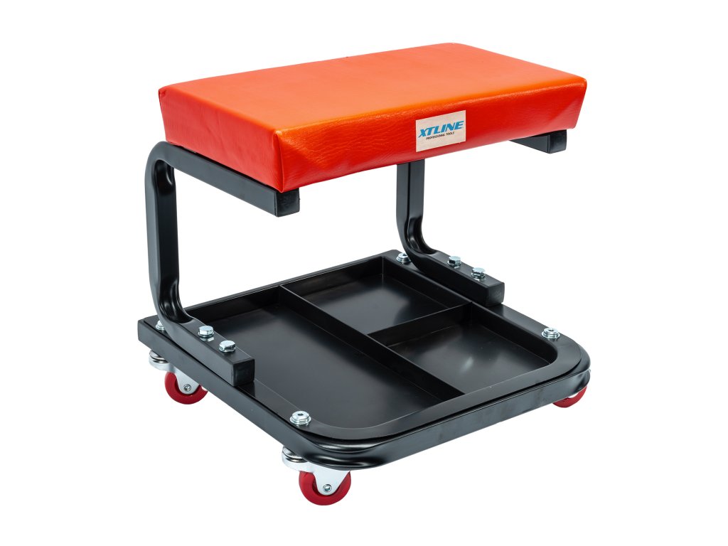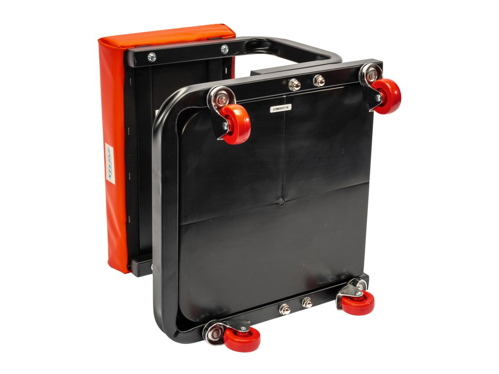 Dílenský pojízdný sedák s polstrováním. Úložná plocha je praktická pro odkládání nářadí při práci.