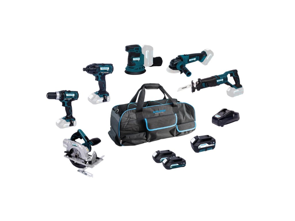 Sada nářadí XTLINE obsahuje aku vrtačku, aku rázový utahovák na bity, aku úhlovou brusku 115 mm, aku vibrační brusku, aku kotoučovou pilu, 2x baterii 18 V 2.0 Ah, 1x baterii 18 V 4.0 Ah a nabíječku baterií. Všechna zařízení jsou vybavena protiskluzovým měkkým držadlem pro ergonomickou a bezpečnou manipulaci. Systém akumulátoru XTLINE poskytne dostatek energie pro celou řadu akumulátorového nářadí XTLINE. Jednou baterií totiž můžete pohánět všechny produkty setu.