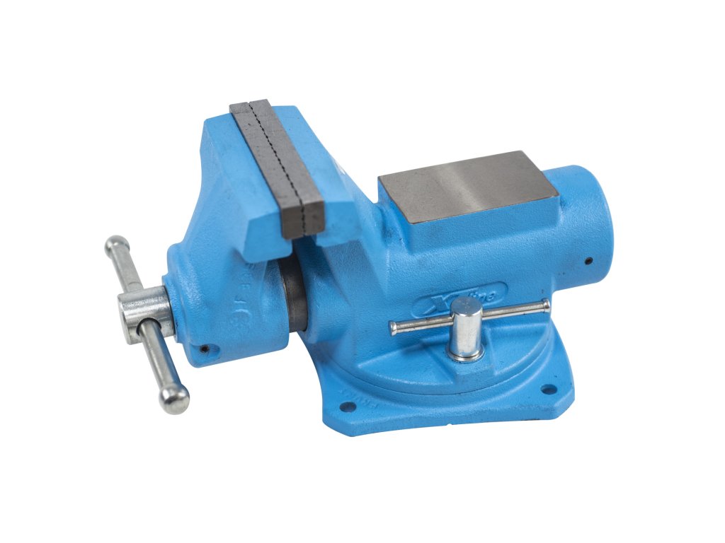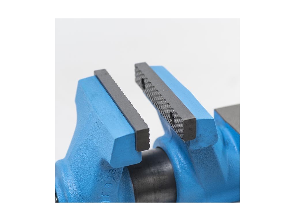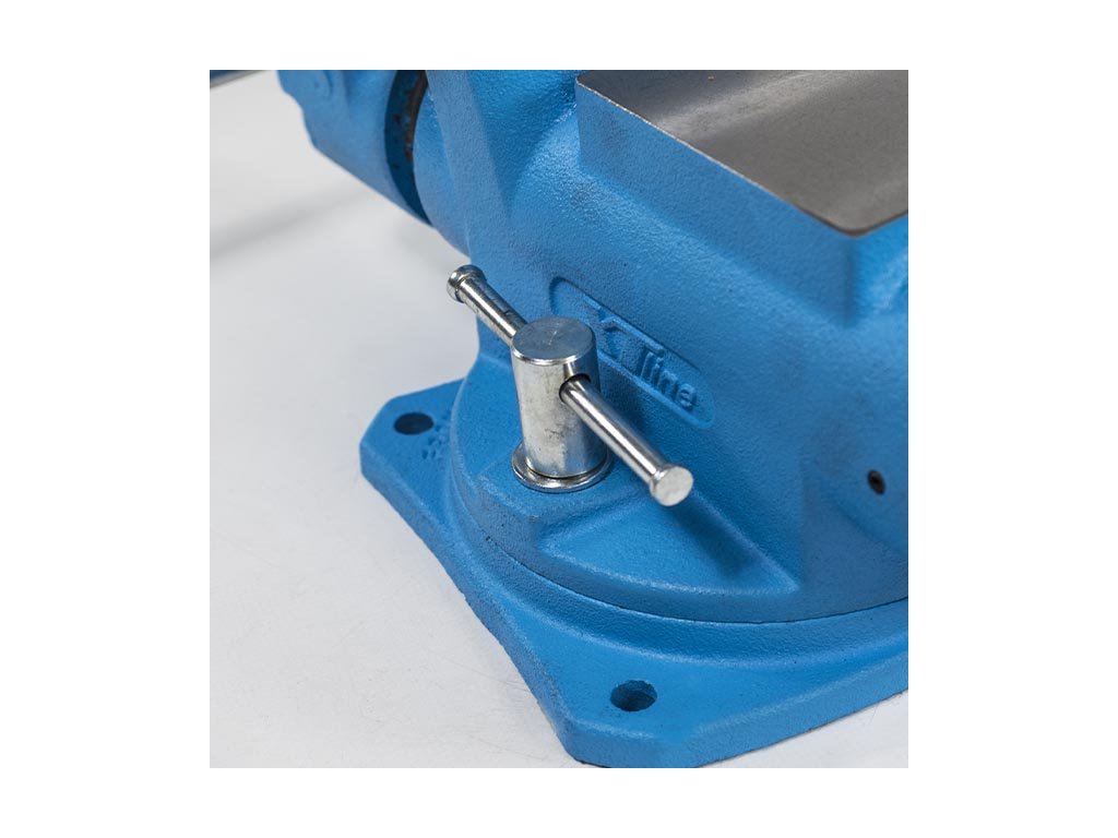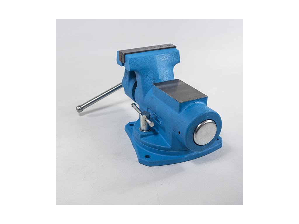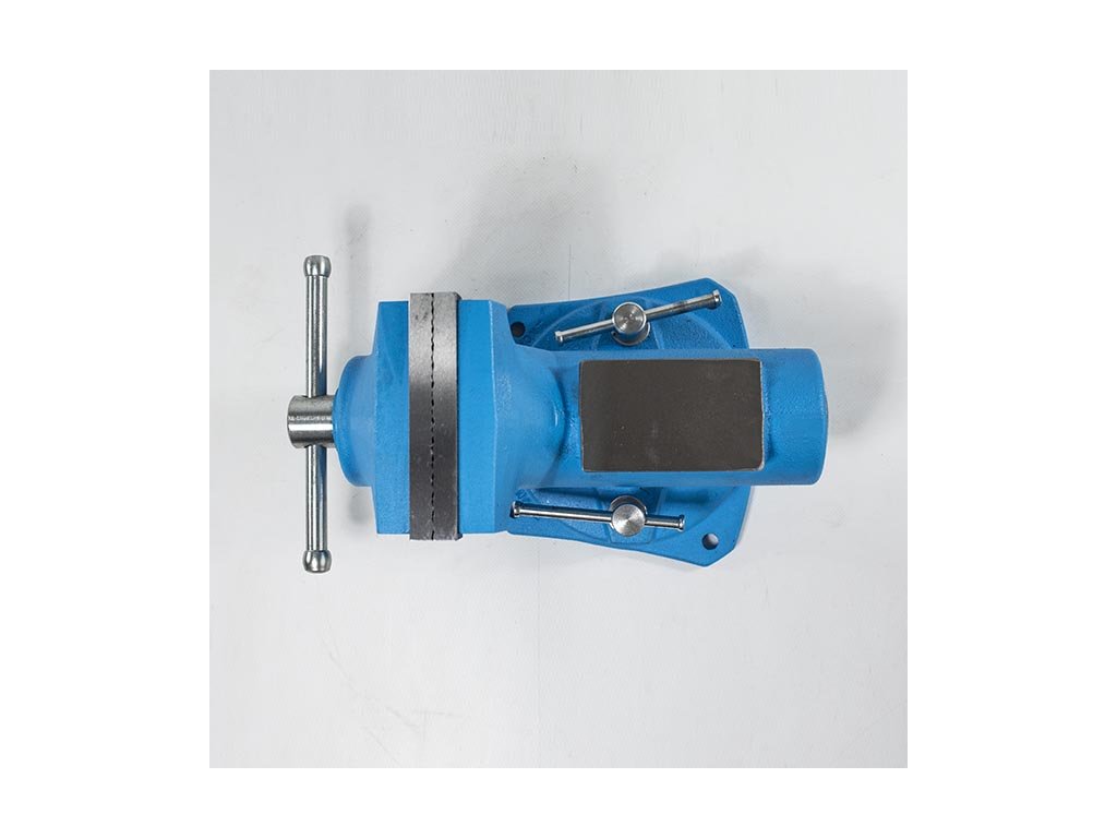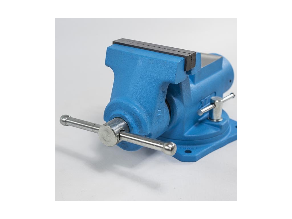 Otočný dílenský svěrák s čelistmi z vysoce kvalitní oceli kalenými na 45 HRC ± 5 HRC. Horizontálně otočná základna. Litinové tělo s opracovanými upínacími čelistmi a kovadlinou. Velká kovadlina Integrovaná, otočná deska ±35° s polohovacími šrouby. Přesné válcové vedení. Upevnění k základové desce maticemi. Přichycení k desce stolu šrouby. Vratidlo s bezpečnostními koncovkami.