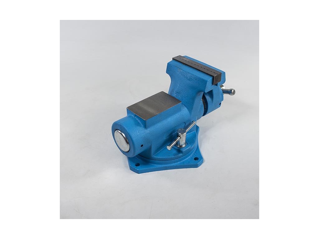 Otočný dílenský svěrák s čelistmi z vysoce kvalitní oceli kalenými na 45 HRC ± 5 HRC. Horizontálně otočná základna. Litinové tělo s opracovanými upínacími čelistmi a kovadlinou. Velká kovadlina Integrovaná, otočná deska ±35° s polohovacími šrouby. Přesné válcové vedení. Upevnění k základové desce maticemi. Přichycení k desce stolu šrouby. Vratidlo s bezpečnostními koncovkami.