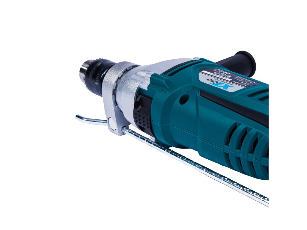 Příklepová vrtačka s kovovým sklíčidlem a přední části těla slouží pro přesné, snadné vrtání do všech materiálů, díky příklepu i do stavebních materiálů. Vrtačka je dobře ovladatelná díky velkým vypínačům, přepínači směru chodu a plynulé regulaci otáček.