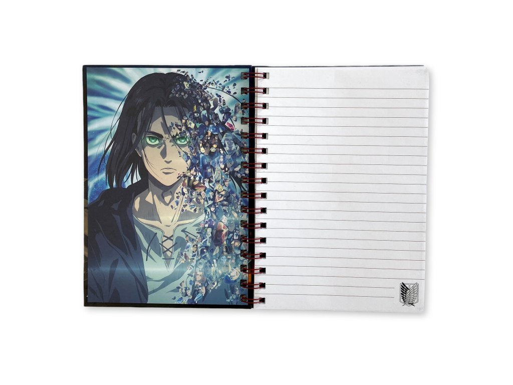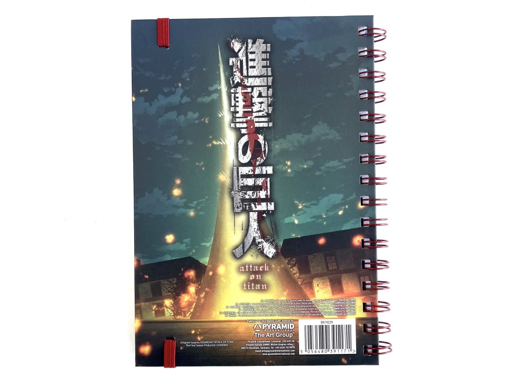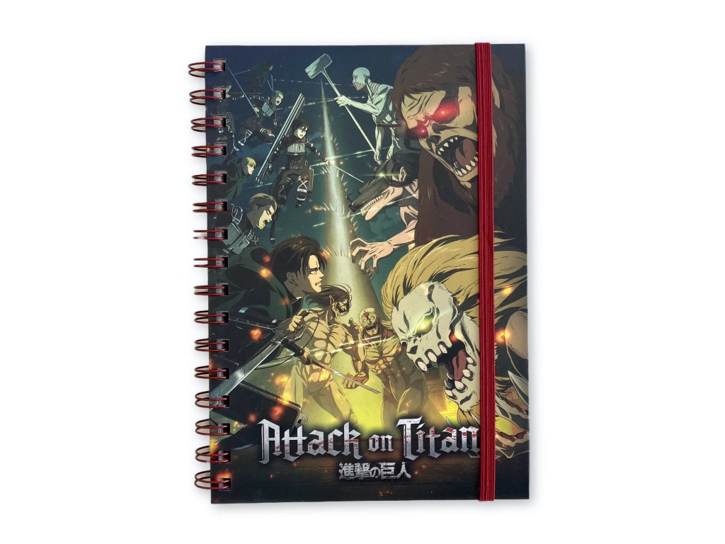Zápisník v kroužkové vazbě s grafikou čtvrté řady japonské temné fantasy mangy Attack on Titan bude skvělým místem pro vaše poznámky a nápady! Zápisník je linkovaný, zavírá se pomocí gumičky.