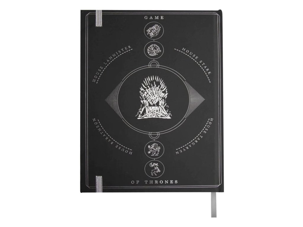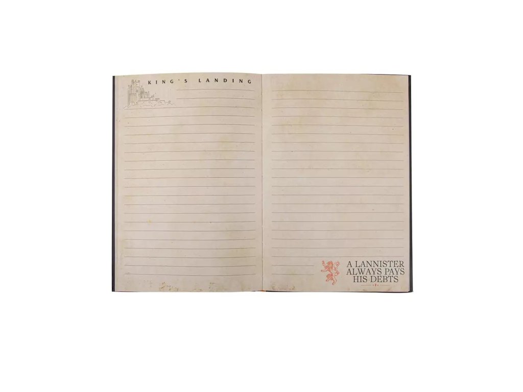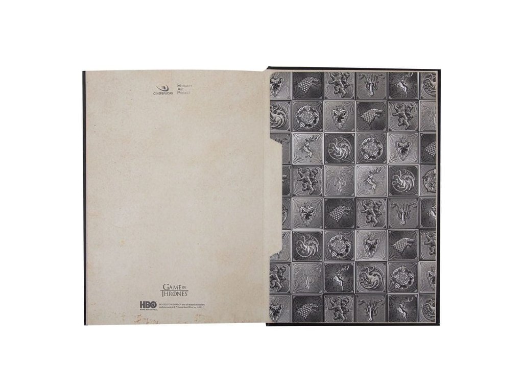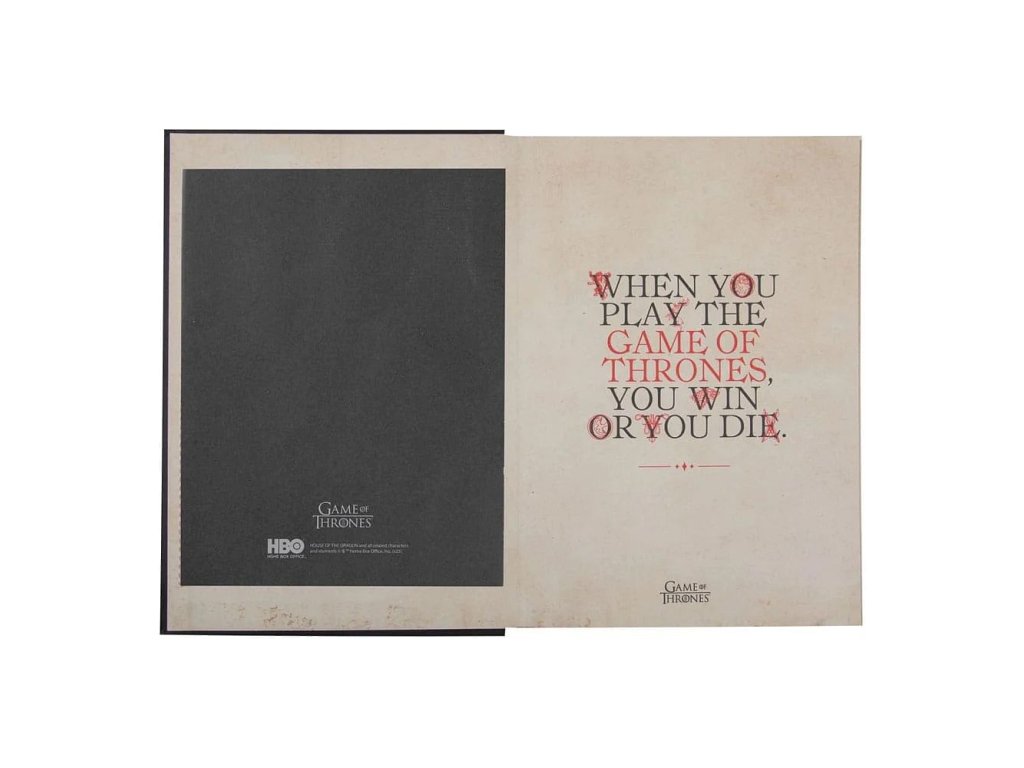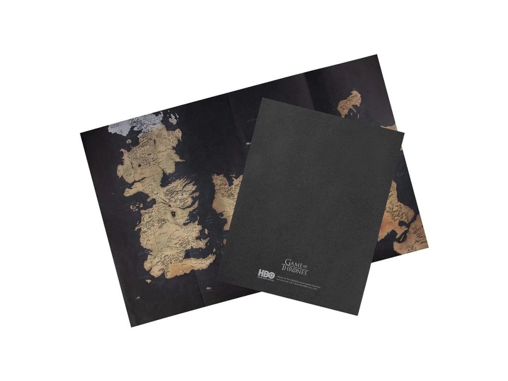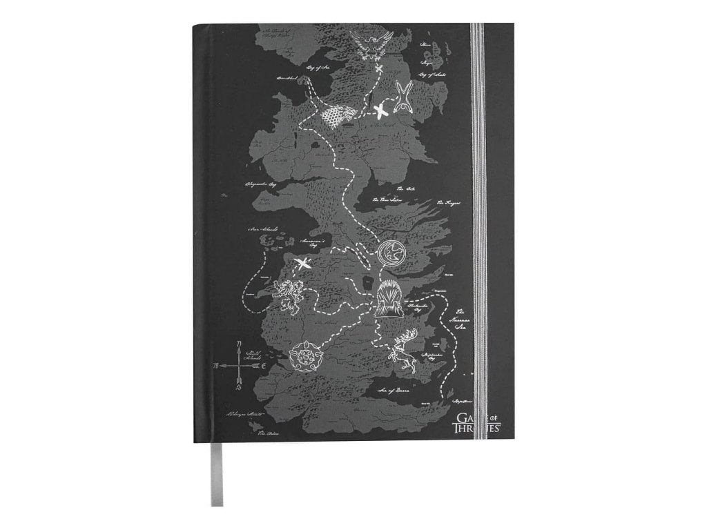 Linkovaný zápisník v pevných deskách potěší fanoušky fantasy série Game of Thrones - Hra o trůny a jako bonus obsahuje mapu Westerosu (Západozemí). Součástí zápisníku je záložka, uzavírá se pomocí gumičky. Rozměry rozložené mapy jsou 51 x 33 cm.