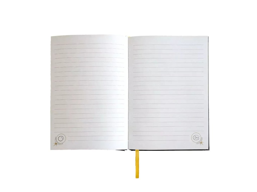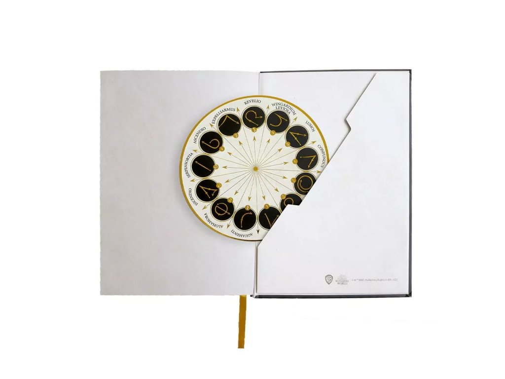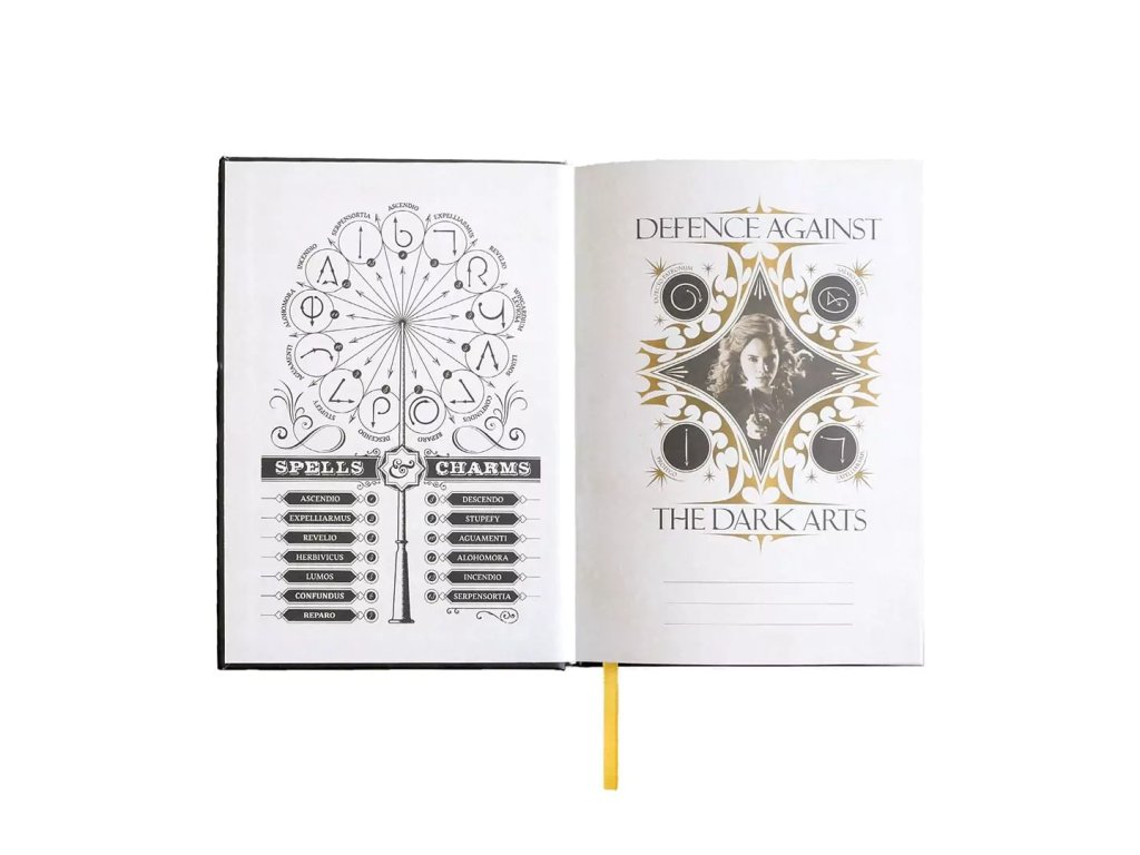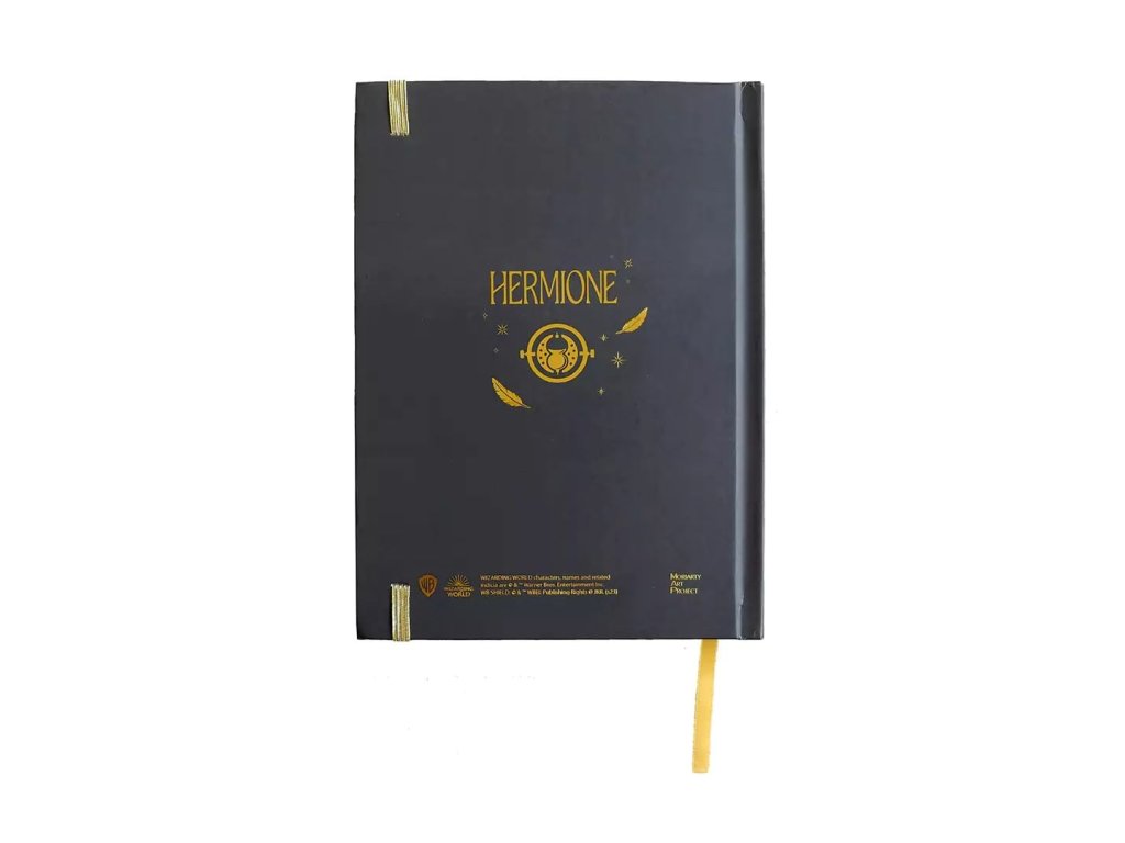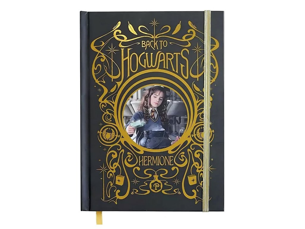 Krásný linkovaný zápisník v pevných deskách pro fanoušky Harry Pottera a Hermiony Grangerové. Zápisník obsahuje vnitřní papírovou kapsu a záložku, zavírá se pomocí gumičky.