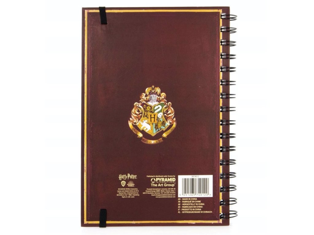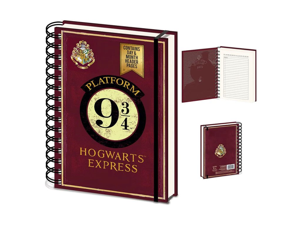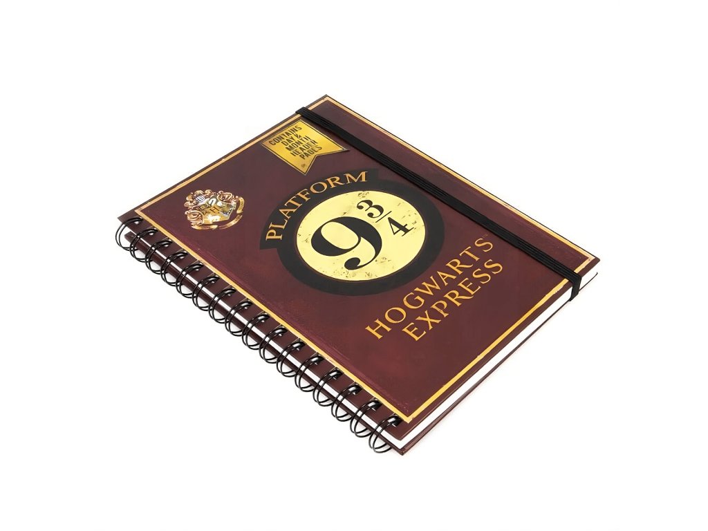 Praktický zápisník v kroužkové vazbě s deskami, které zdobí symbol Nástupiště 9 a 3/4 z Harry Pottera. Zápisník je linkovaný, zavírá se pomocí gumičky a uvnitř nechybí grafika Bradavického expresu.