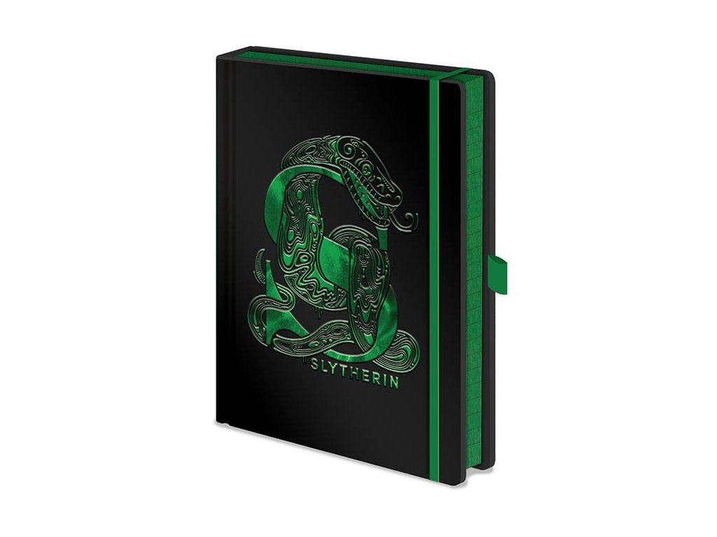 Pěkný linkovaný zápisník v pevných deskách ve stylu koleje Zmijozel (Slytherin) z příběhů o Harrym Potterovi. Svěřte své nápady a poznámky krásně provedenému hadímu patronovi zmijozelské koleje! Součástí zápisníku je gumička na zavírání.