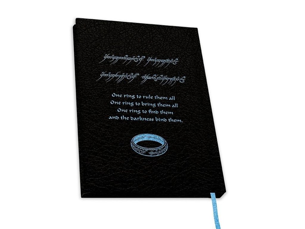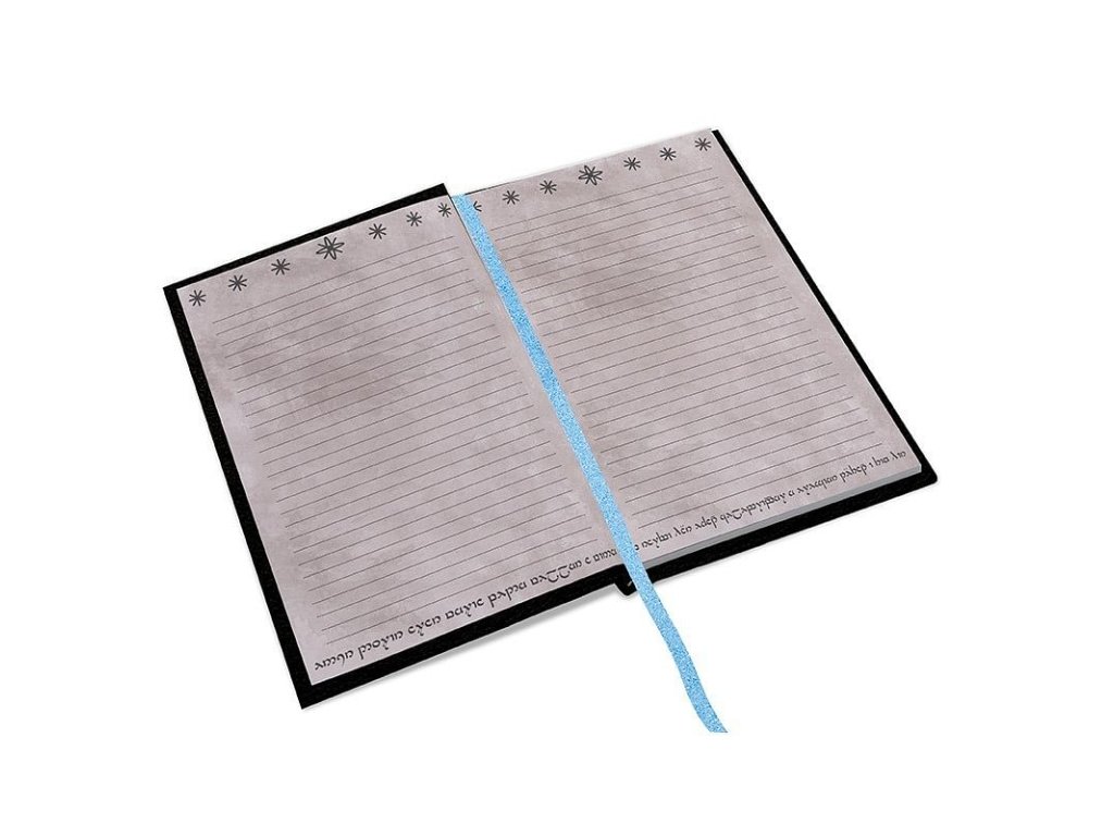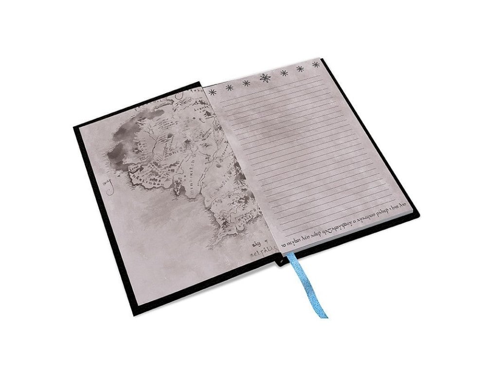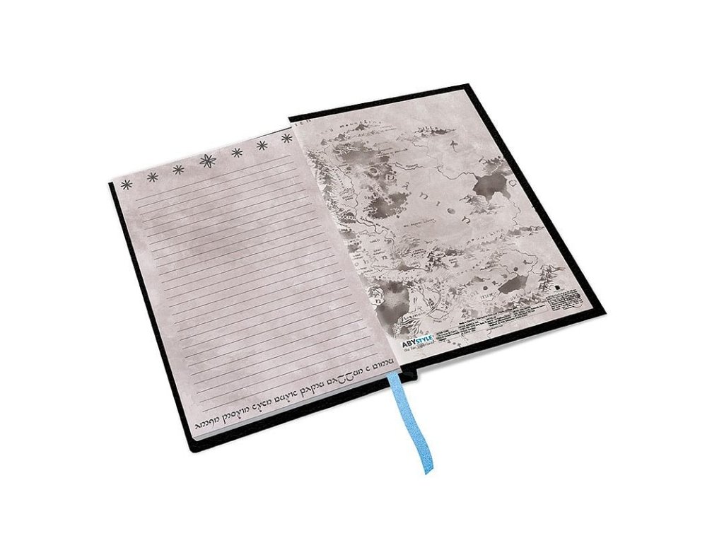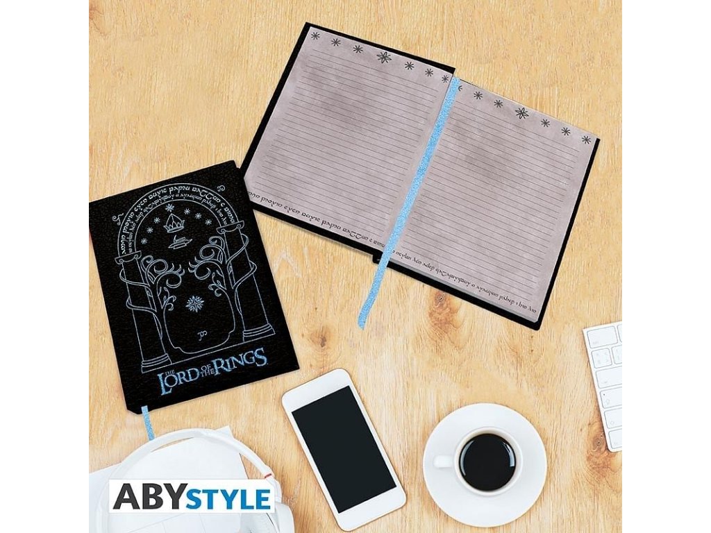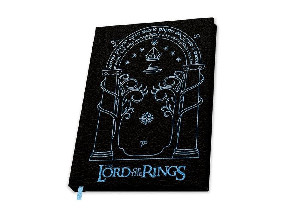 Precizně vyvedený linkovaný zápisník v pevných deskách s grafikou Durinových dveří - Západní brány Morie (také Trpasluj nebo Khazad-dûm) je tím správným místem pro poznámky a nápady milovníků fantasy trilogie Pán prstenů. Zadní stranu obálky zdobí Prsten moci, na vnitřní straně desek se nachází mapa Středozemě a součástí zápisníku je i záložka.