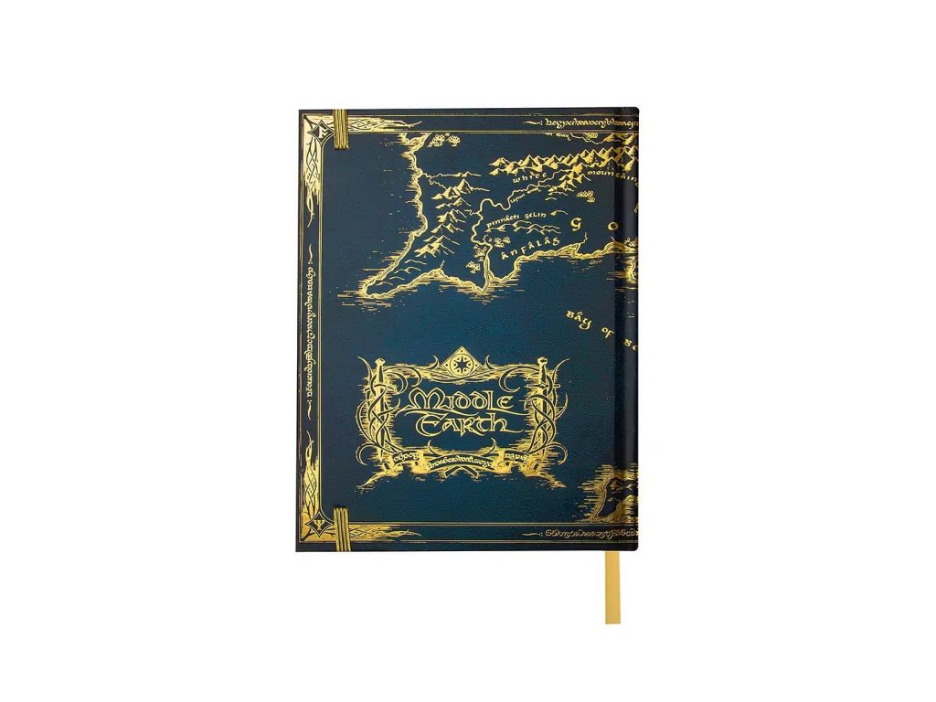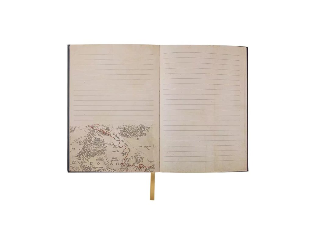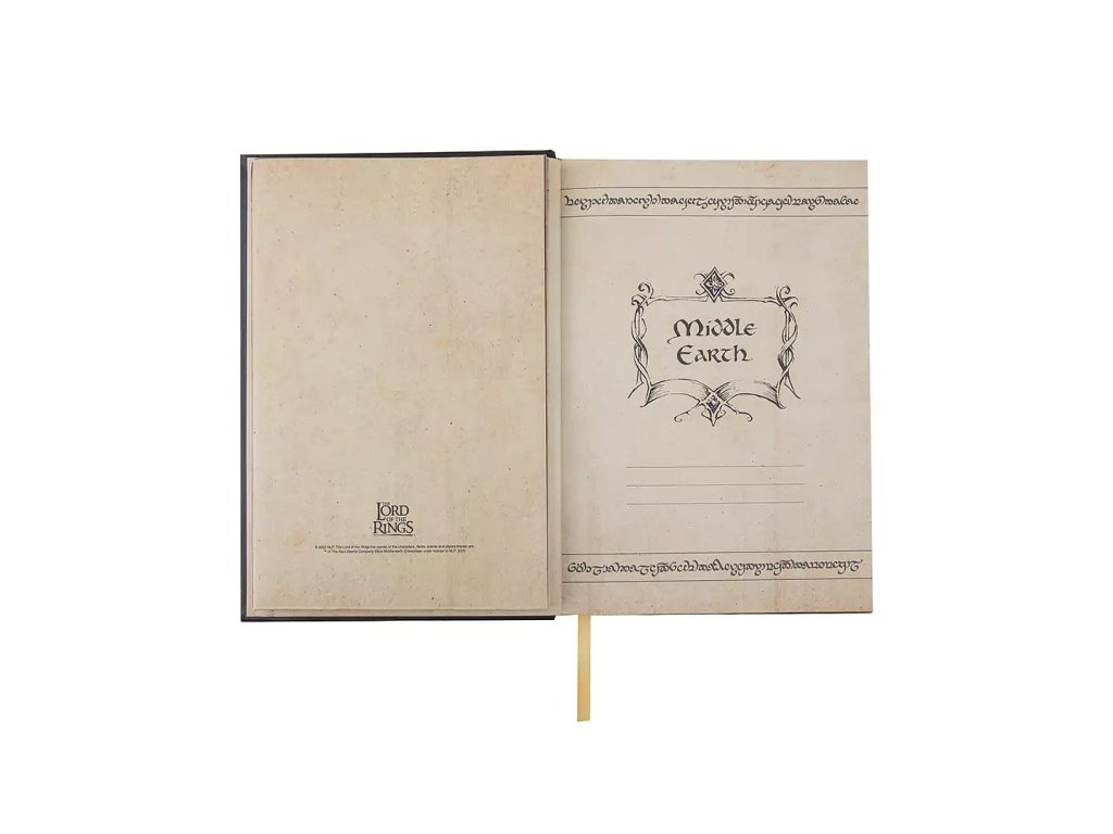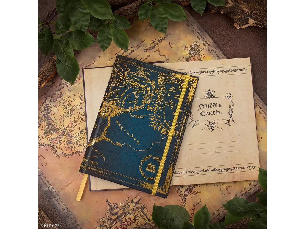 Krásný linkovaný zápisník v pevných deskách pro všechny fanoušky fantasy trilogie Pán prstenů s bonusem v podobě mapy Středozemě. Součástí zápisníku je záložka, uzavírá se pomocí gumičky. Rozměry rozložené mapy jsou 40 x 40 cm.