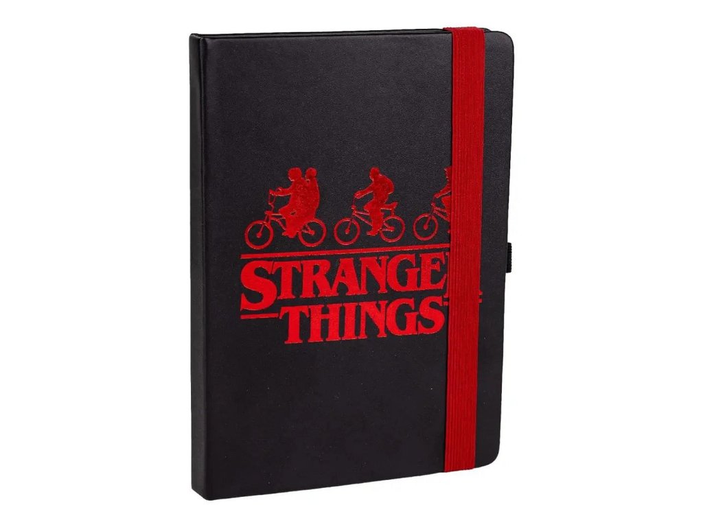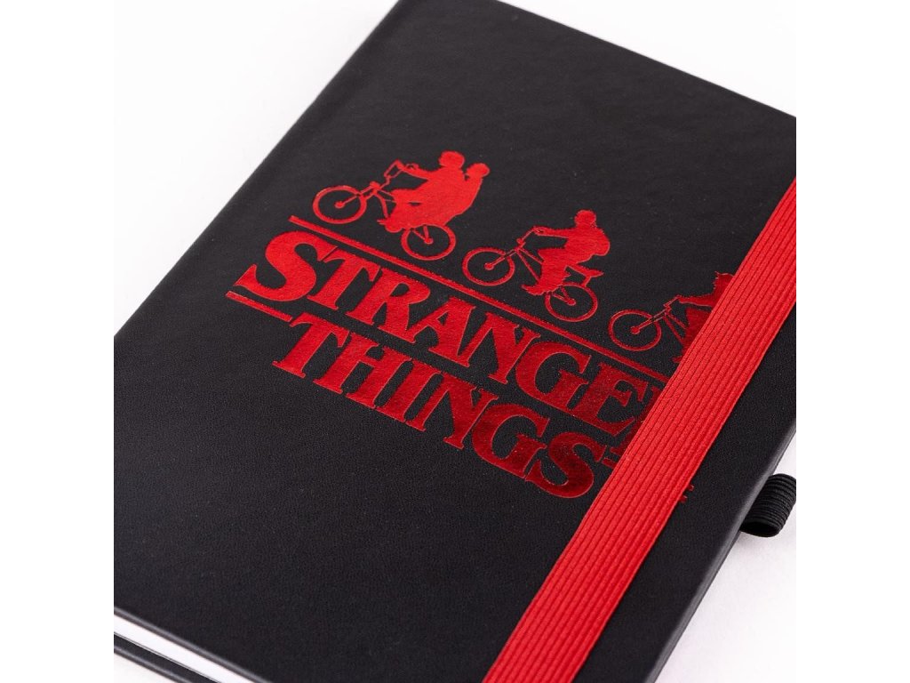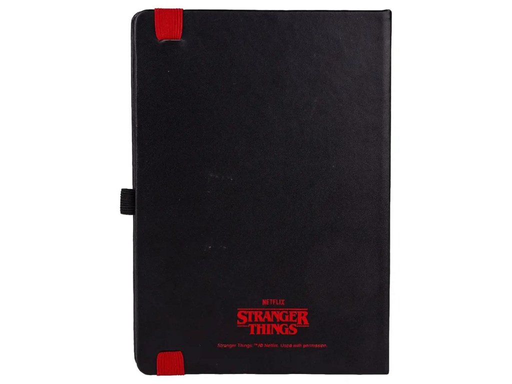 Zápisník v černých deskách z umělé kůže a krásným raženým logem seriálu pro fanoušky Stranger Things - to správné místo pro vaše nápady, poznámky nebo obrázek Demogorgona. Zápisník je linkovaný, má na boku pružné poutko na propisku a zavírá se pomocí červené gumičky.