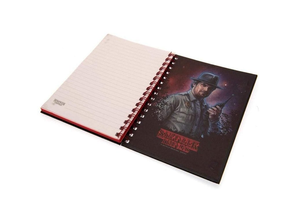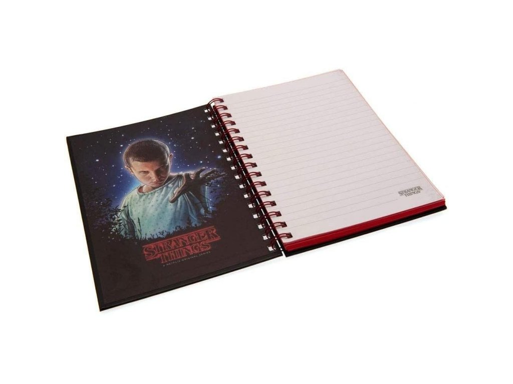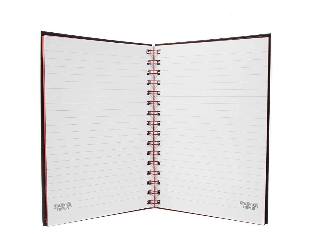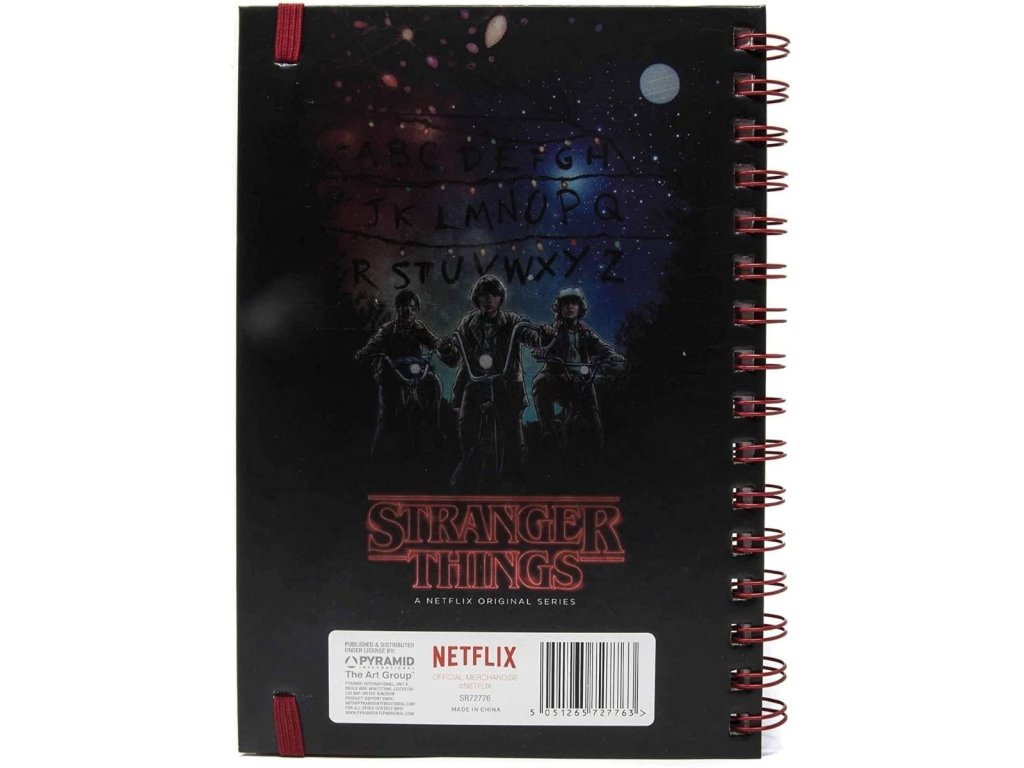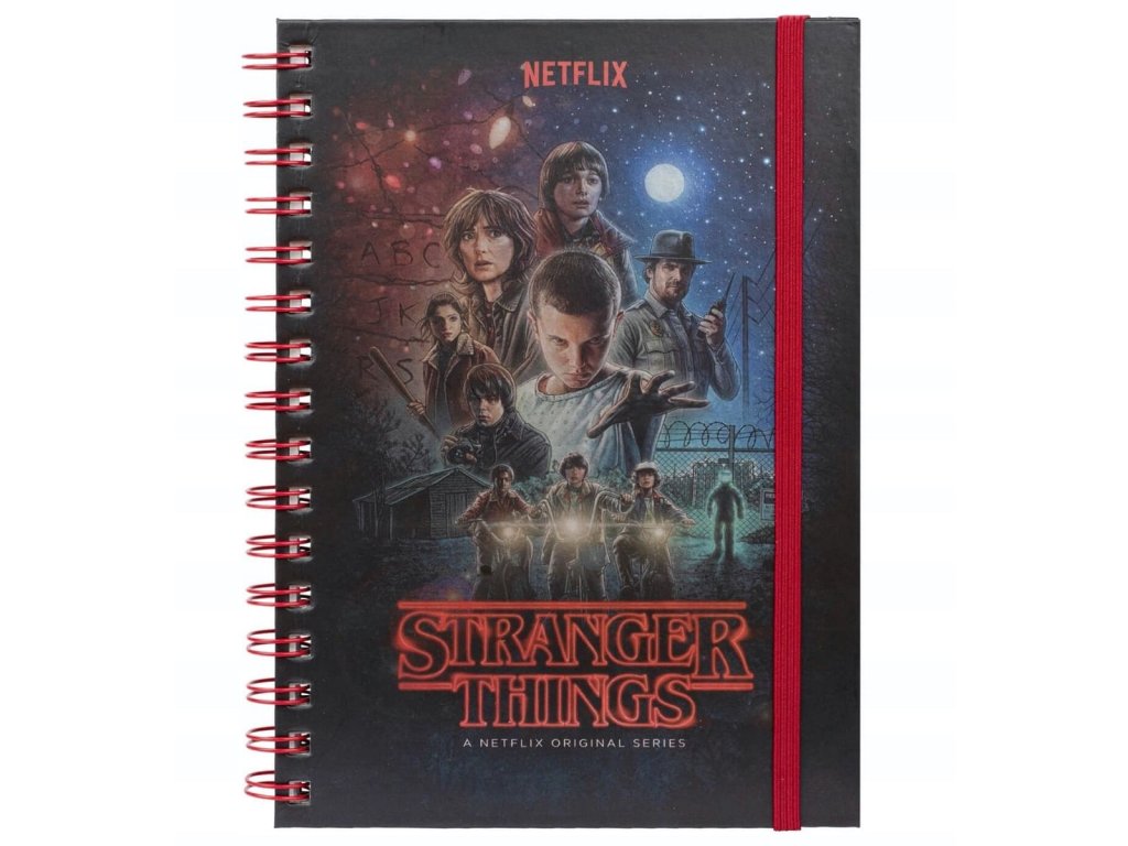 Pěkný zápisník v kroužkové vazbě s grafikou hororového seriálu Stranger Things má 200 linkovaných stran a zavírá se pomocí elastické stužky.