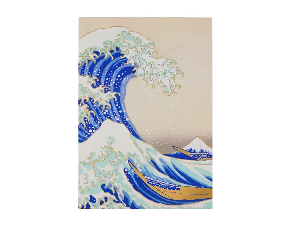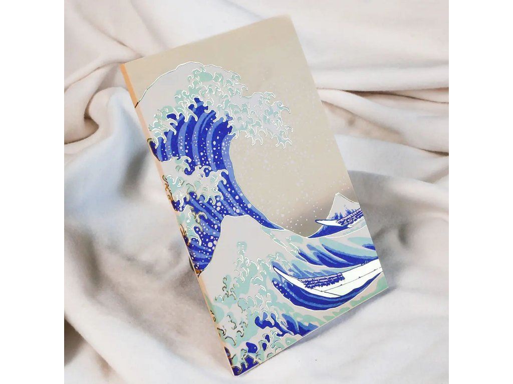 Překrásný zápisník s motivem slavného díla japonského malíře Hokusaie Kacušiky: Velká vlna u pobřeží Kanagawy (神奈川沖浪裏), také známá jako Velká vlna, obsahuje 120 stránek a má měkký obal. Na přední straně obalu najdeš autorovo dílo s laminací ve zlaté barvě. Na každém listu zápisníku je autorův podpis a na zadní straně obalu najdeš originální japonský název řady krajinářských výtisků od Hokusaie - Třicet šest pohledů na horu Fudži. Zapisuj si své nápady, myšlenky a příběhy do krásného zápisníku s japonským uměním!