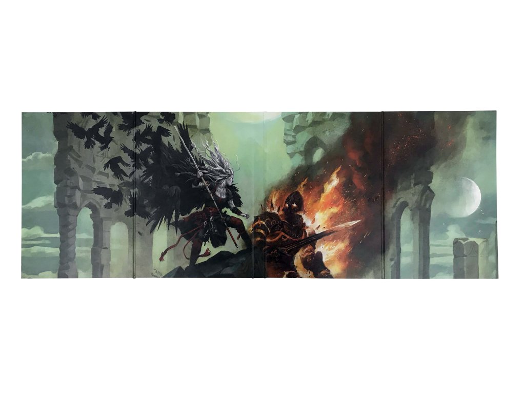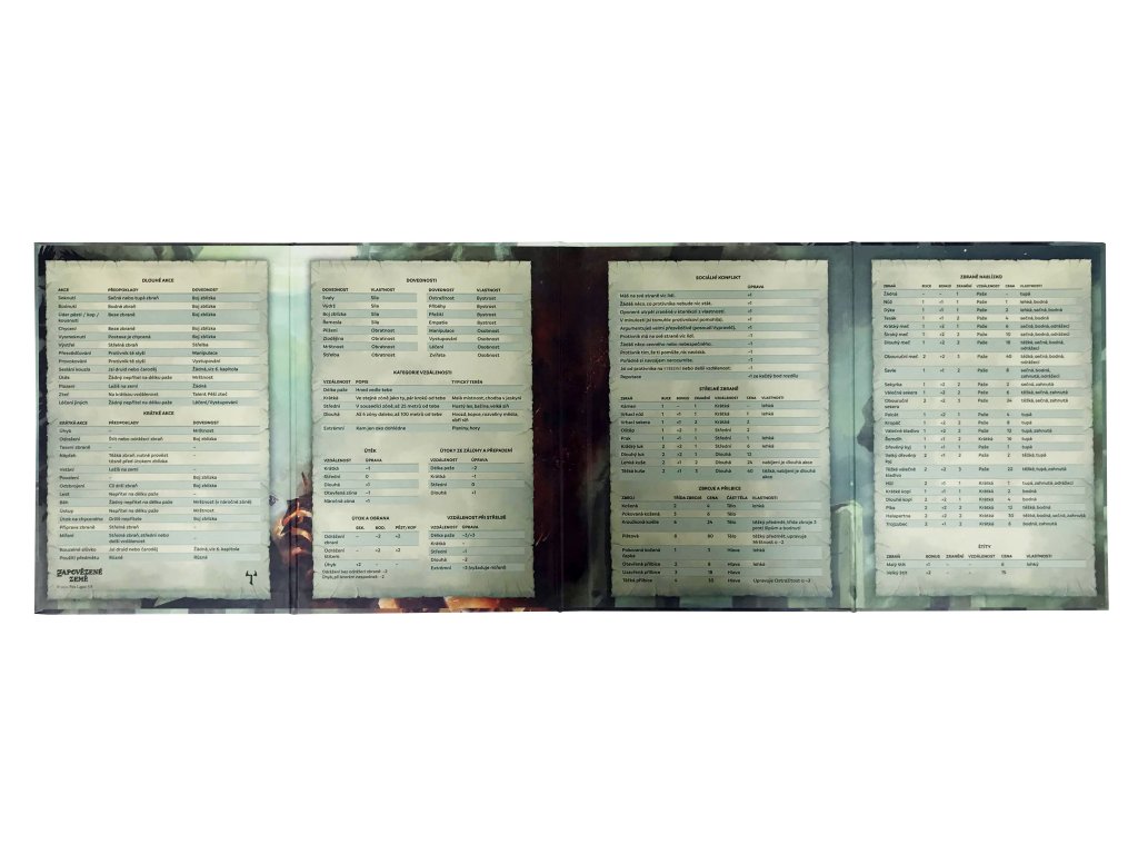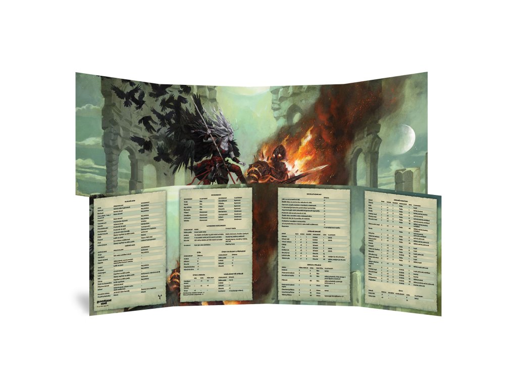 Zástěna pro vypravěče je určena pro hru na hrdiny Zapovězené země. Zvenčí se nachází ilustrace Alvara Tapia, uvnitř nalezne vypravěč užitečné herní tabulky: Dlouhé akce, Krátké akce, Dovednosti, Kategorie vzdálenosti, Útěk, Útoky ze zálohy a přepadení, Útok a obrana, Vzdálenost při střelbě, Sociální konflikt (z odstavců v pravidlech zde převedeno do tabulky), Střelné zbraně, Zbroje a přilbice, Zbraně nablízko, Štíty. Rozložená zástěna měří 68,8 x 24 cm. Odkazy Více o Zapovězených zemích Facebook Discord Rpgforum D20 Videorecenze