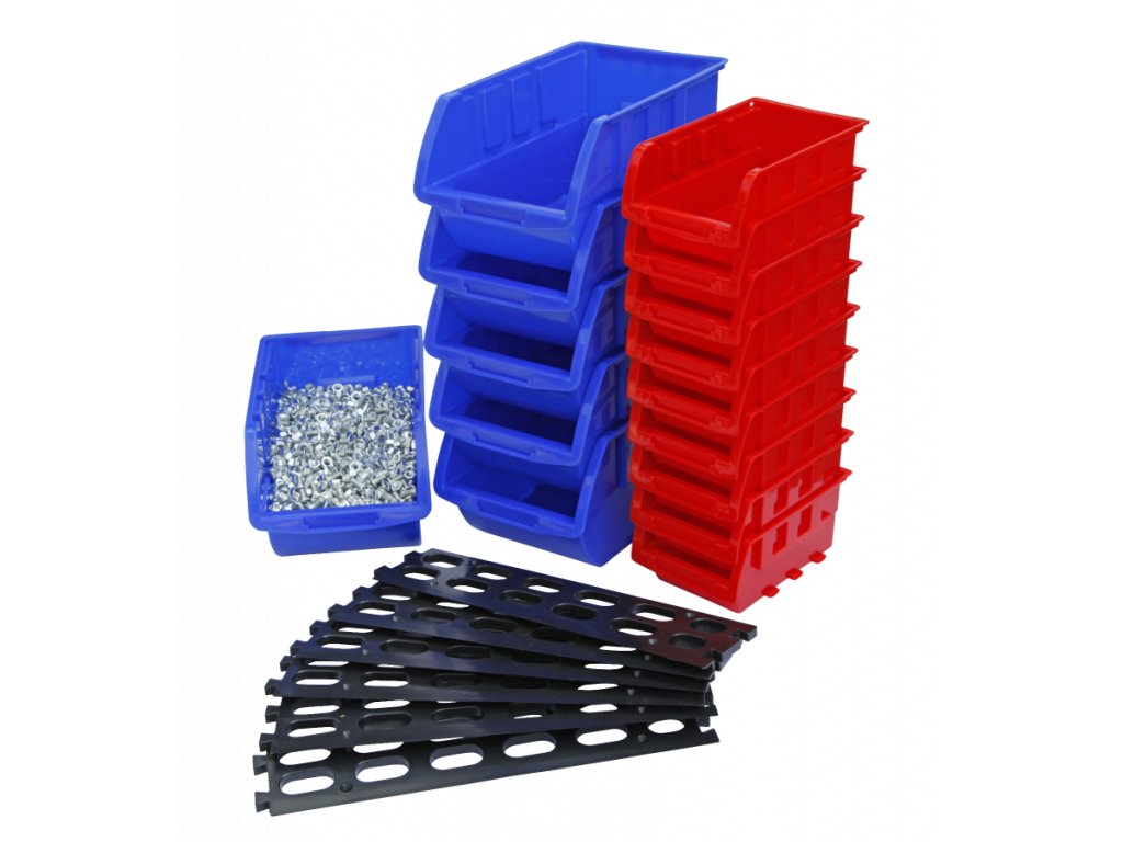 Plastové boxy v celkovém počtu 15 ks jsou rozdělené na 9 ks malých boxů o rozměru 14 x 8,2 cm a 6 ks velkých boxů o rozměru 21 x 12,7 cm.