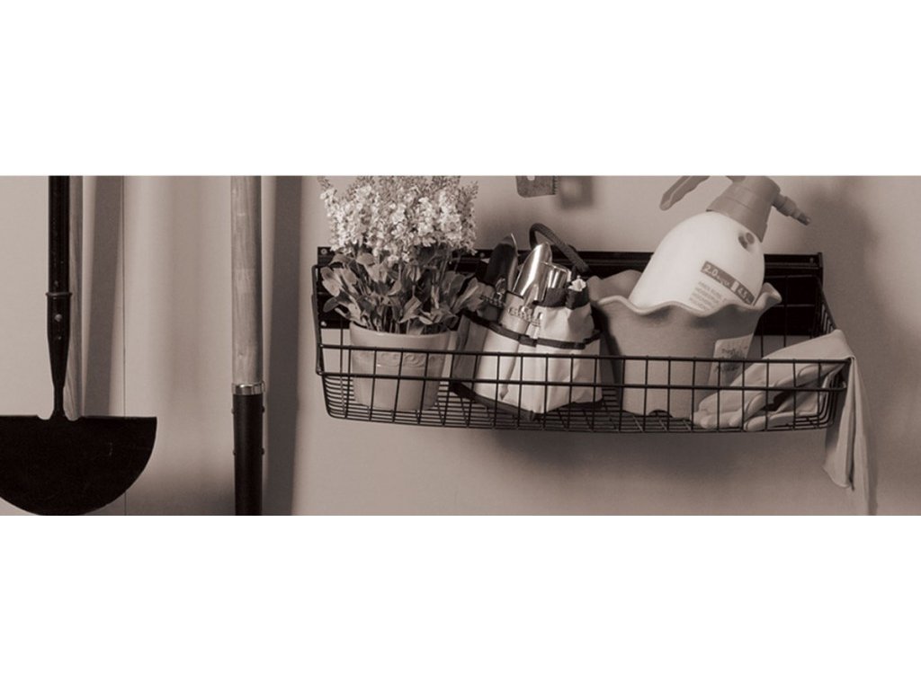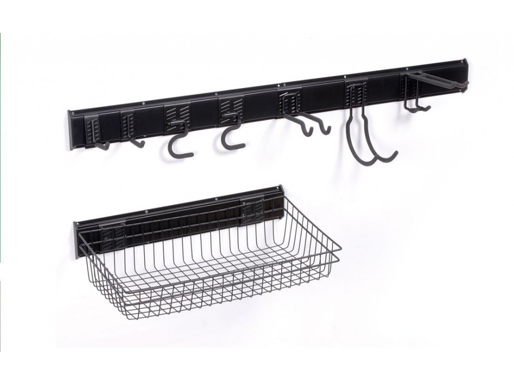 Multifunkční závěsný systém ideální pro organizaci zahradního nářadí, vysoká efektivita prostoru, 3 závěsné lišty a 7 háčků a závěsný koš.
