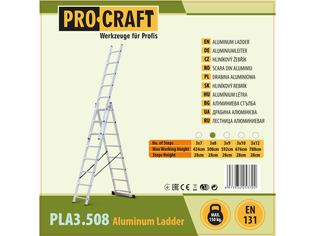 Žebřík hliníkový třídílný 3x8 Procraft PLA3.508 Nosnost: max. 150Kg Certifikace: EN131. Počet příček: 3x8 Materiál: hliník Hmotnost: 11 kg