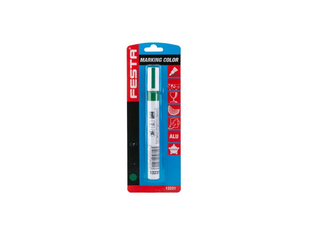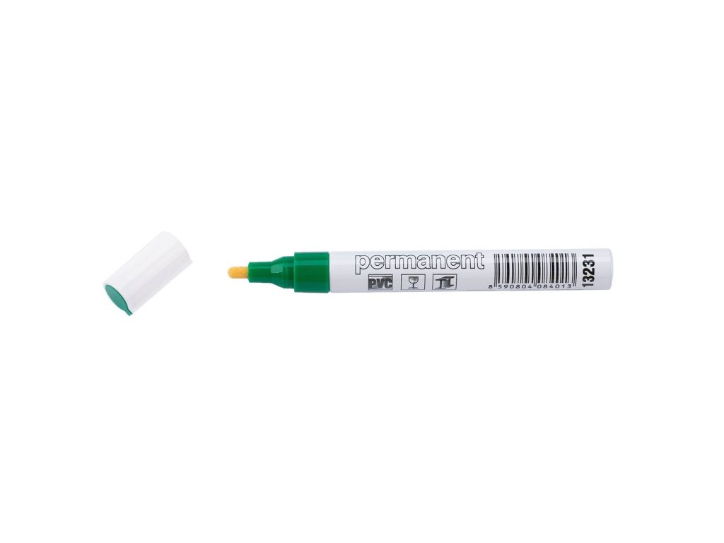 Speciální značkovací barva v hliníkovém pouzdře - zelený, síla hrotu 4 mm - popisy železných konstrukcí, skla, plastů, černých strečových folií a tmavých podkladů, max.80°C.